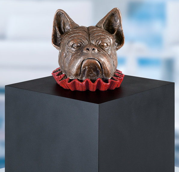 Ein Meister der ironischen Überhöhung und der absurden Komik ist der Künstler Guido Messer, 1941 in Argentinien geboren. Sein "Hund im Würfel" macht stutzig. Die menschlichen Gesichtzüge der Bulldogge, deren Hals von einer gefältelten Manschette umkränzt ist, wecken Erinnerungen, wenn nicht gar Beklommenheit. Der Körper des Tieres scheint sich in dem großen schwarzen Würfel zu verbergen, aus dem sein Kopf herausragt.