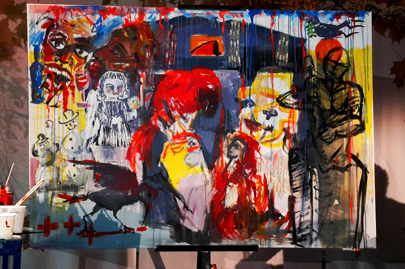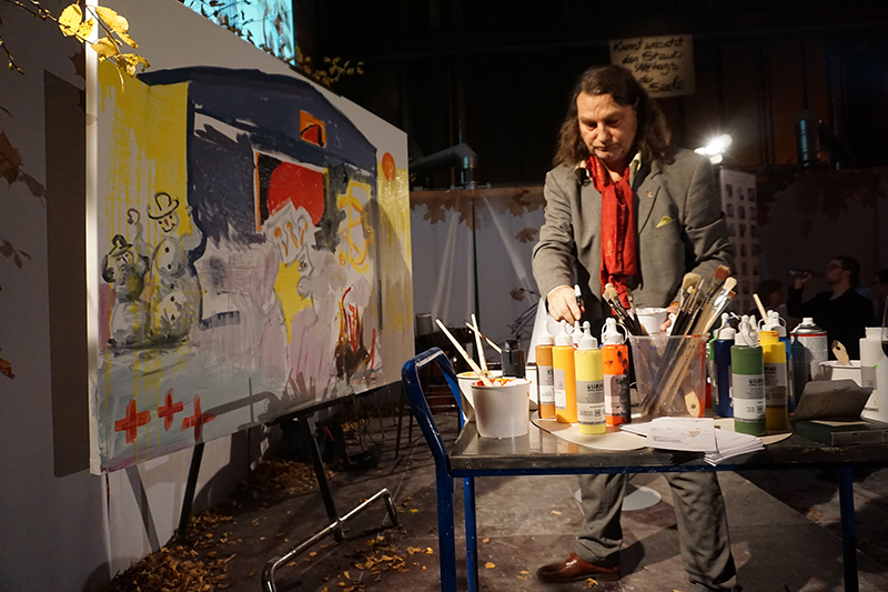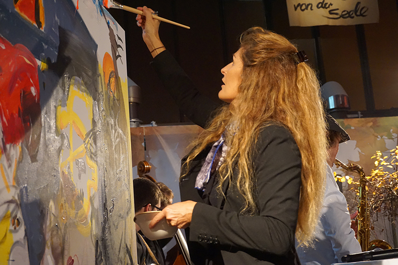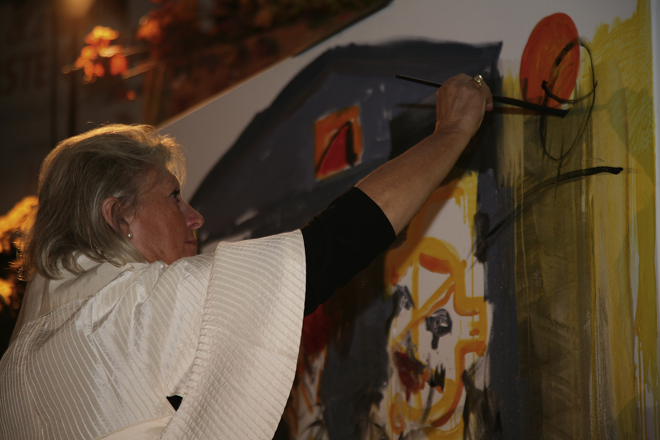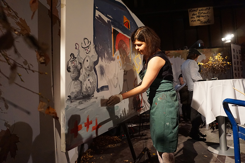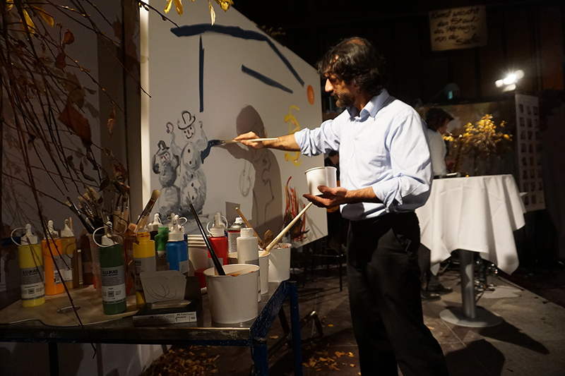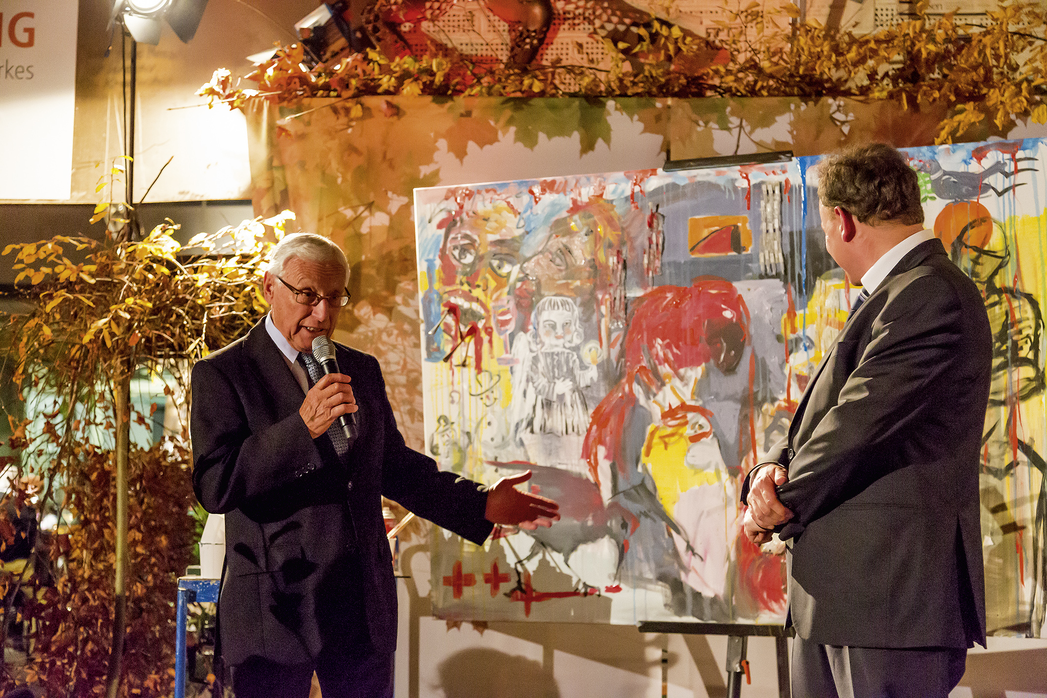 Der Höhepunkt der Vernissage war die Entstehung eines gemeinschaftlichen Kunstwerkes mit dem Titel "Winterwärme", dessen anschließende Versteigerung 4.500 € erbracht hat. Der Erlös geht an das Göppinger stationäre Hospiz.