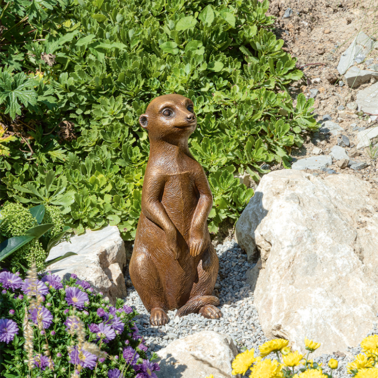 Dem Erdmännchen fliegen die Sympathien der Menschen geradewegs zu. Das liegt nicht allein daran, dass sie als niedlich und putzig wahrgenommen werden. Es liegt auch daran, das Erdmännchen äußerst soziale Wesen sind, in größeren Verbänden miteinander leben und aufeinander aufpassen. Und genau das macht unser Exemplar: Es übernimmt die Rolle des Wächters, setzt sich aufrecht und beobachtet die Umgebung auf das Genaueste. Sei es nun die Savanne oder hier: Der Garten.