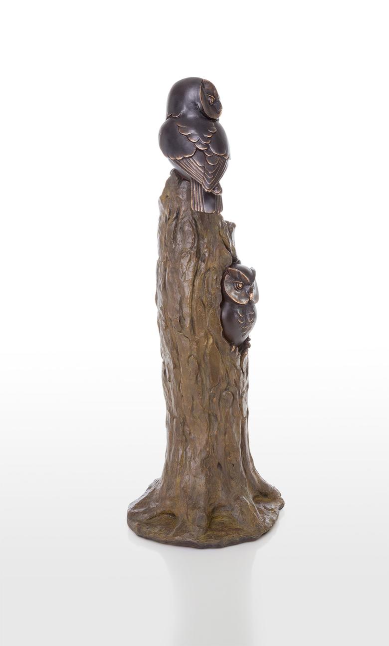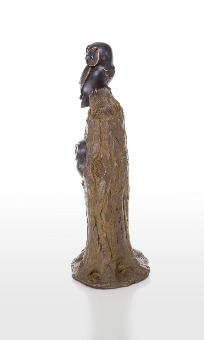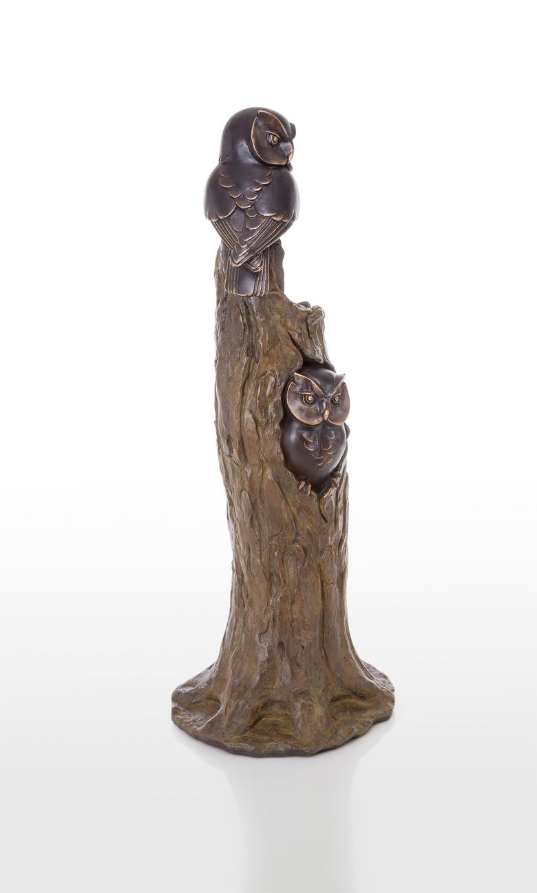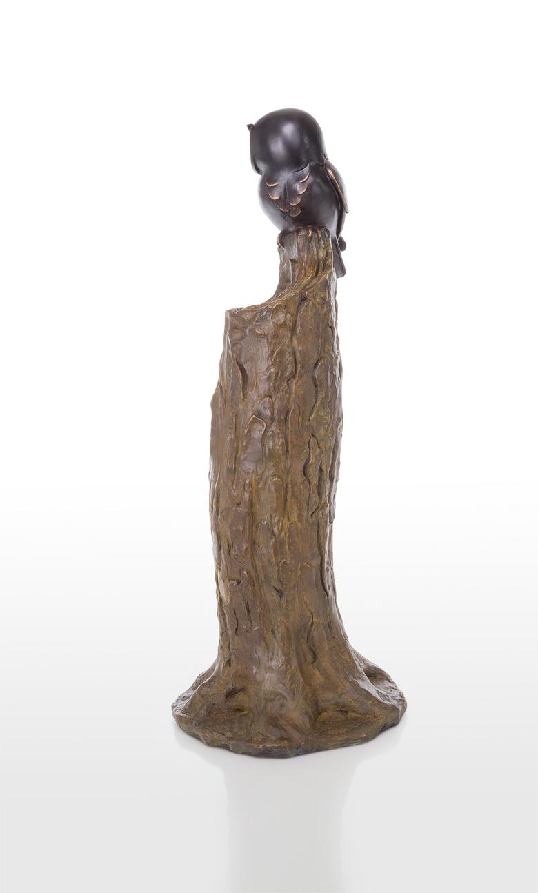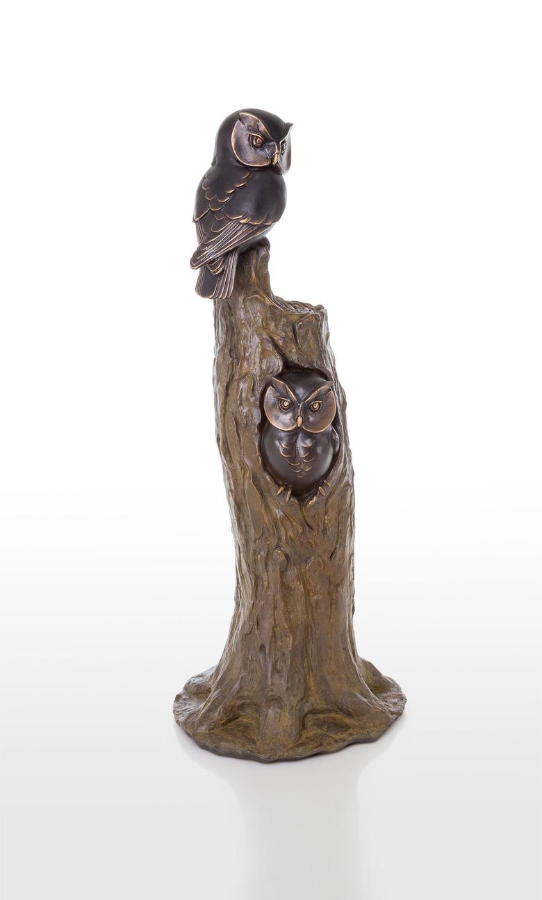 Der Eule werden Weisheit und Weltverständnis zugeschrieben. Kein Wunder, sitzt sie oft regungslos und doch wachen Auges da, das hektische Treiben um sich herum genau beobachtend. Das gilt auch für diese zwei bronzenen Exemplare auf und in ihrem Baumstumpf. Ihren rechten Platz hat die Skulptur vielleicht an einem Ort im Garten, an dem man sich selbst ebenfalls zur tieferen Betrachtung des Weltenlaufs (und sei es durch intensive Zeitungslektüre) zurückziehen kann.