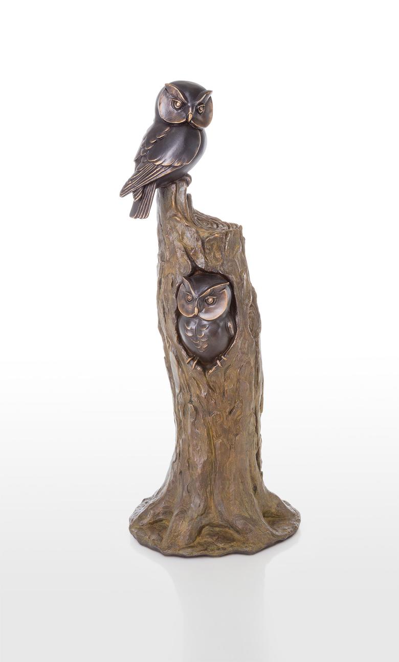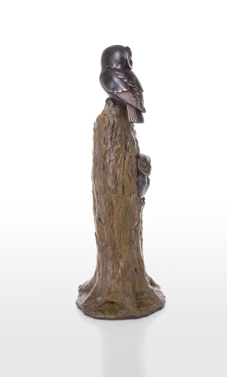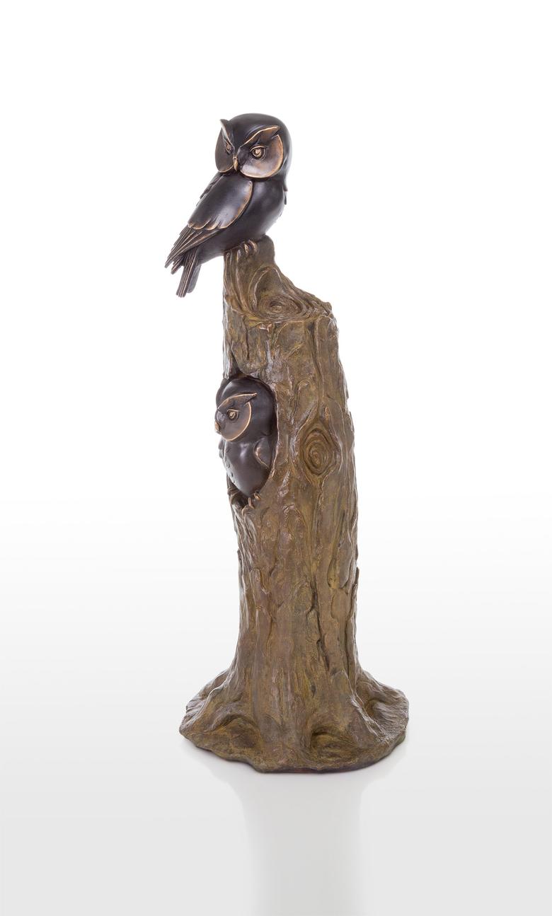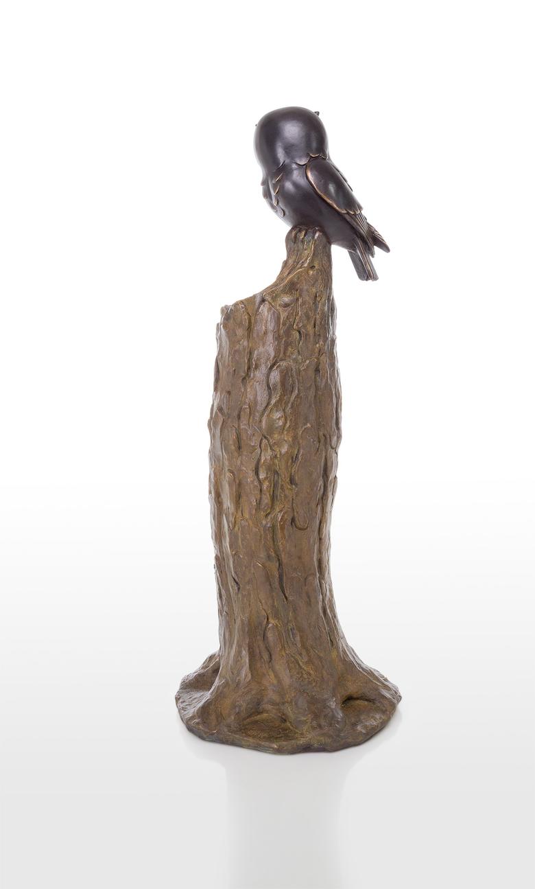 Der Eule werden Weisheit und Weltverständnis zugeschrieben. Kein Wunder, sitzt sie oft regungslos und doch wachen Auges da, das hektische Treiben um sich herum genau beobachtend. Das gilt auch für diese zwei bronzenen Exemplare auf und in ihrem Baumstumpf. Ihren rechten Platz hat die Skulptur vielleicht an einem Ort im Garten, an dem man sich selbst ebenfalls zur tieferen Betrachtung des Weltenlaufs (und sei es durch intensive Zeitungslektüre) zurückziehen kann.