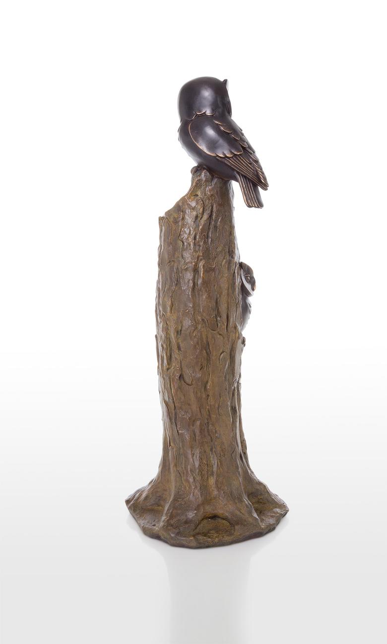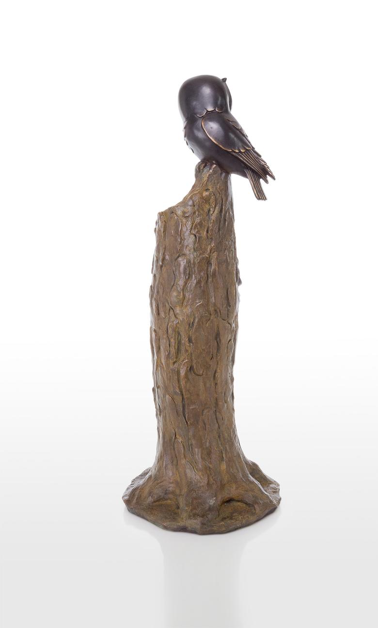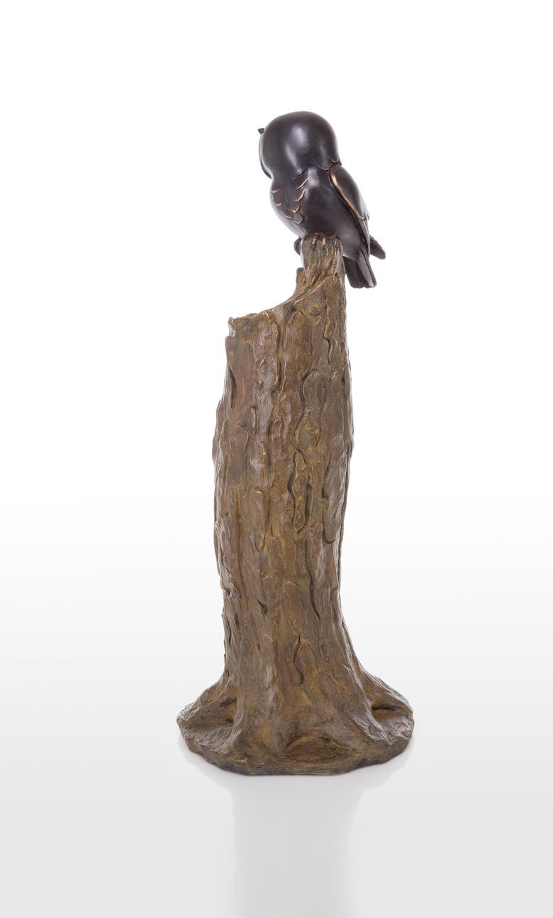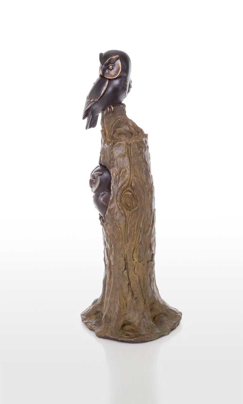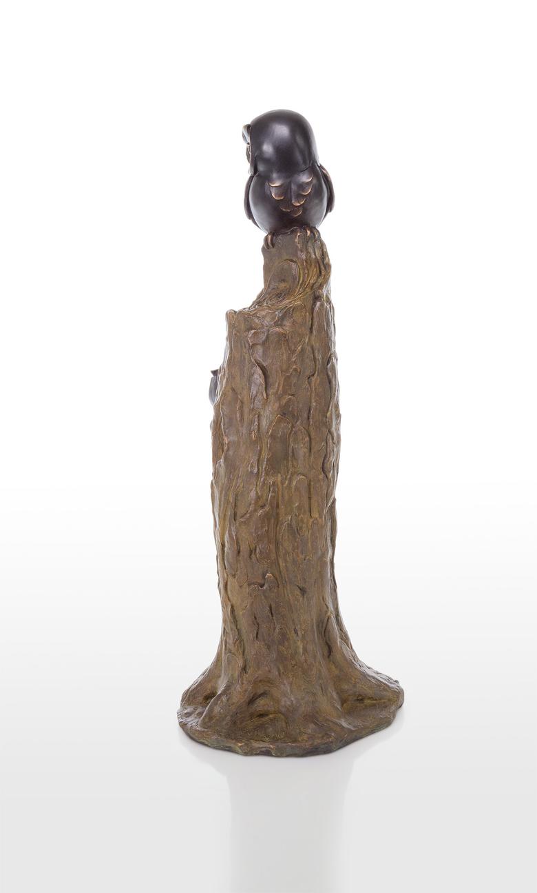 Der Eule werden Weisheit und Weltverständnis zugeschrieben. Kein Wunder, sitzt sie oft regungslos und doch wachen Auges da, das hektische Treiben um sich herum genau beobachtend. Das gilt auch für diese zwei bronzenen Exemplare auf und in ihrem Baumstumpf. Ihren rechten Platz hat die Skulptur vielleicht an einem Ort im Garten, an dem man sich selbst ebenfalls zur tieferen Betrachtung des Weltenlaufs (und sei es durch intensive Zeitungslektüre) zurückziehen kann.