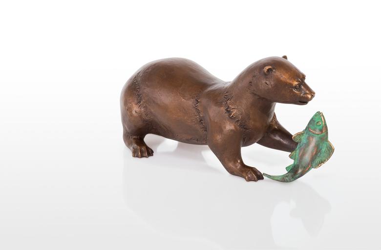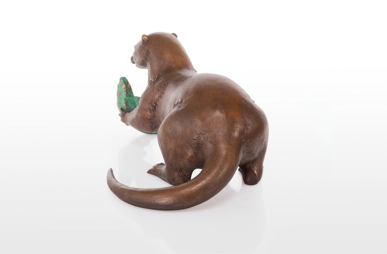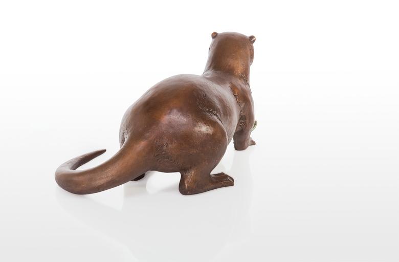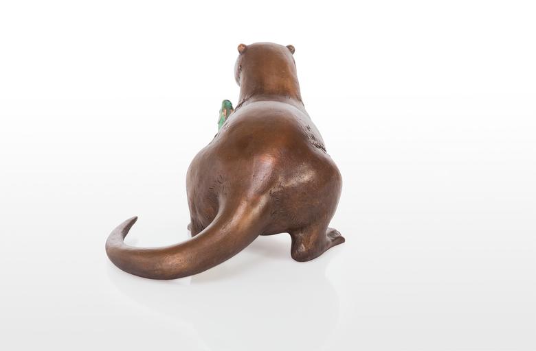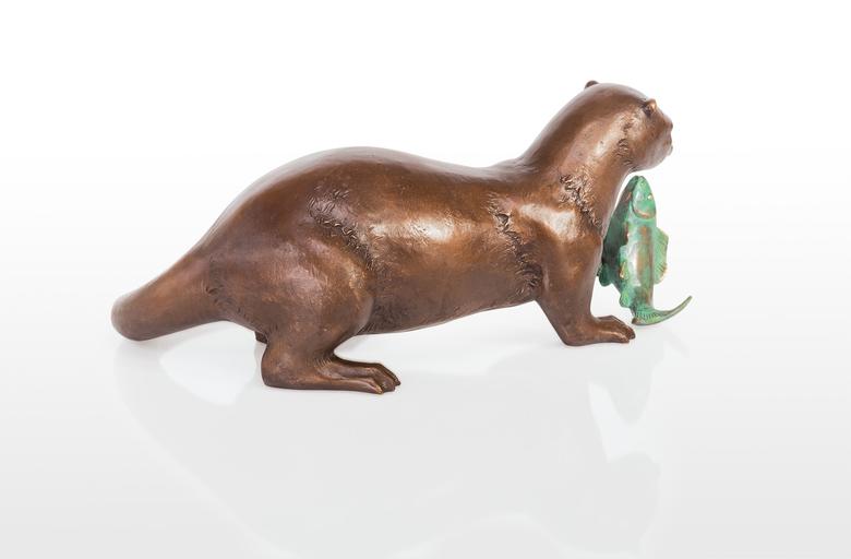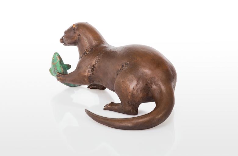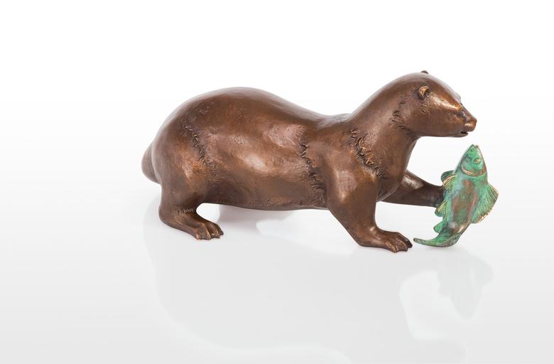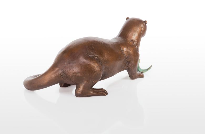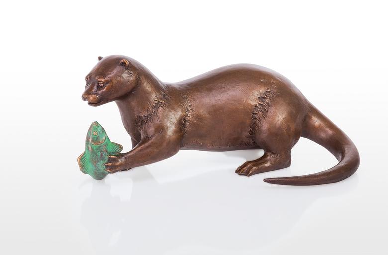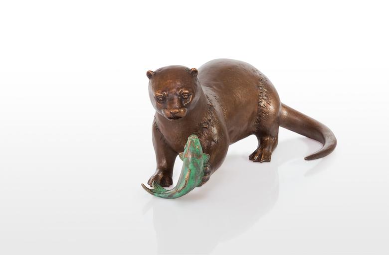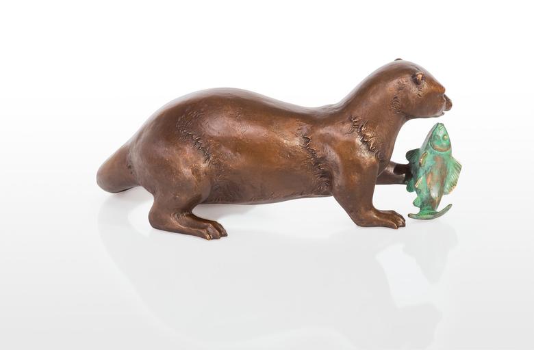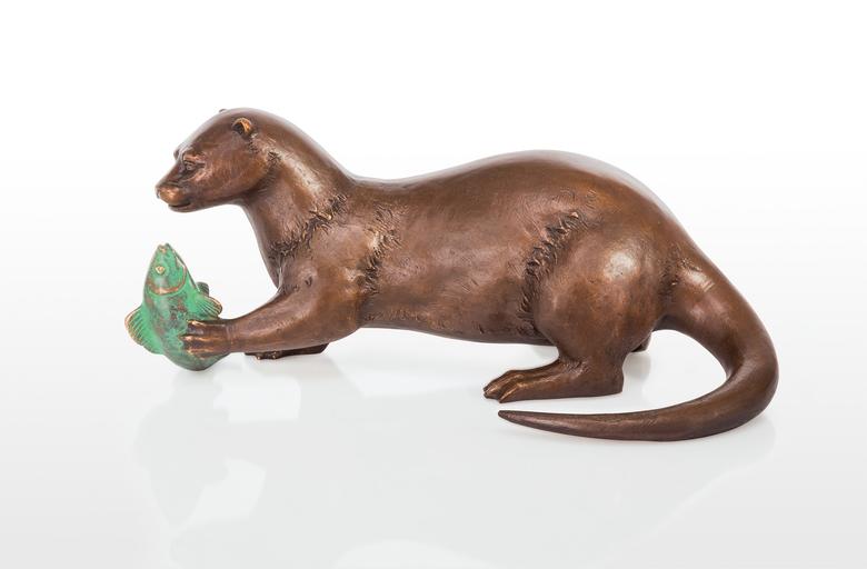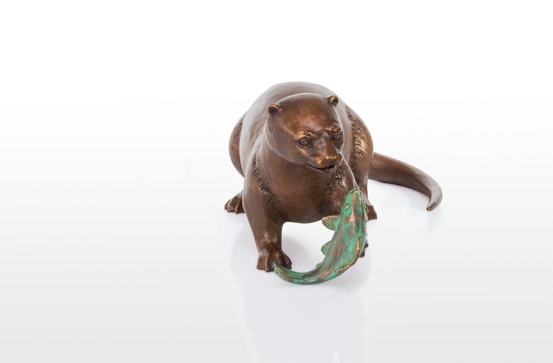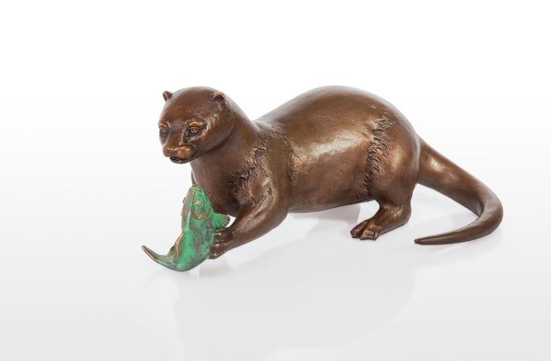 Der Fischotter ist ein schönes, ja geradezu elegant wirkendes Tier. Es ist eine Schönheit, die ihren Ursprung in der Wirksamkeit der Evolution hat: Der stromlinienförmige Körper des Tieres ist ganz an das flinke und geschickte Gleiten durch das Wasser angepasst. Und so ist die Nähe zum Wasser auch sein Lebensraum, sei es ein Fluss, sei es ein Bachlauf oder auch ein See. Der angestammte Lebensraum der nachstehenden zwei Prachtexemplare aus Bronze dürfte entsprechend der Gartenteich sein, wo man sich seines Anblicks erfreuen kann, ohne gleich um die Fische fürchten zu müssen – und sollte einmal ein „echter“ Fischotter des Weges kommen, so signalisiert er ihm wie einst der Hase dem Igel: „Ich bin schon da!“