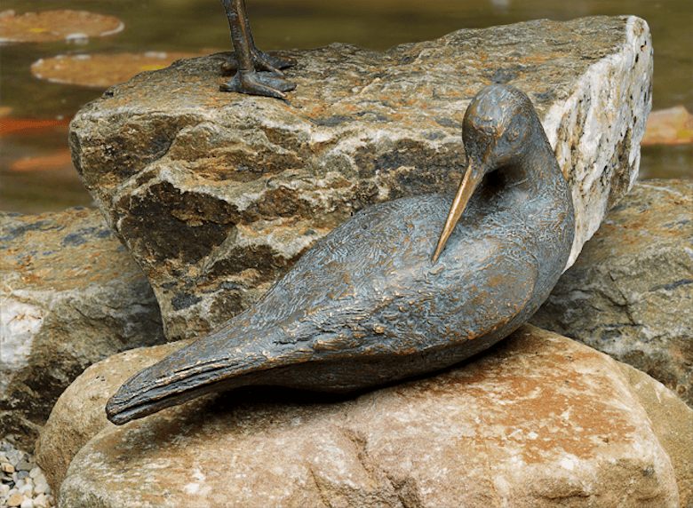 Den Vögeln ist von allen vier Elementen allein das Feuer suspekt; zu Lande und in der Luft bewegen sie sich souverän, und viele, insbesondere diese hier, zieht es darüber hinaus noch unbedingt zum Wasser. Und so sind sie der perfekte Schmuck für den Gartenteich.