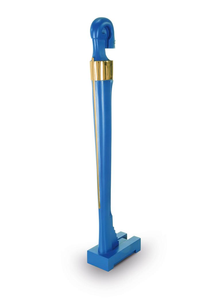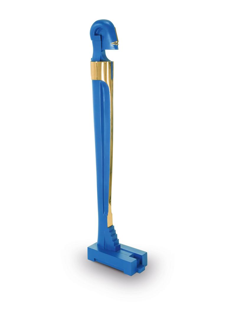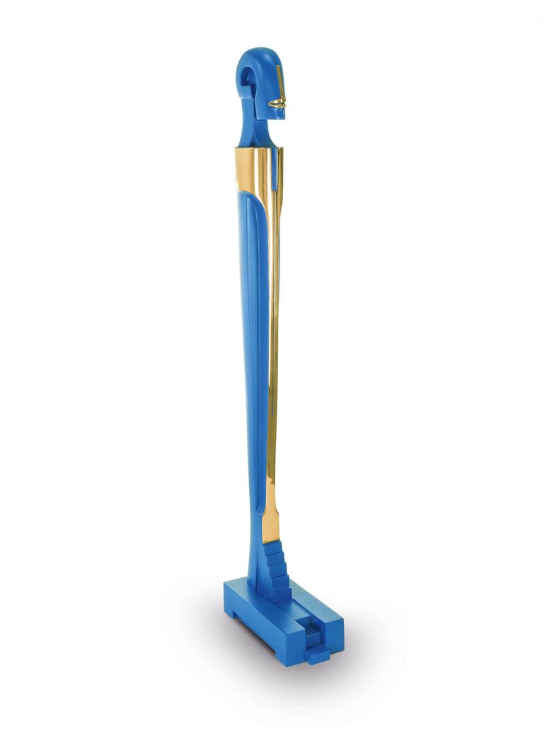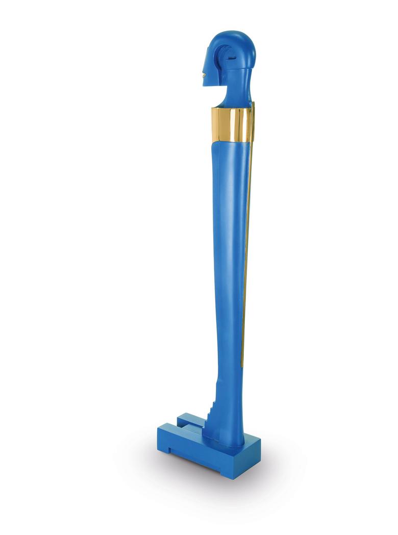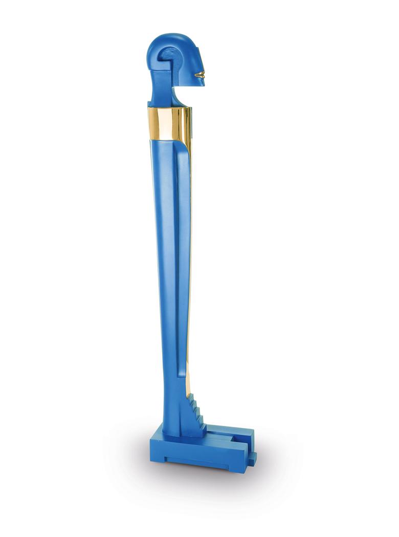Hoch auf einem mattgestrahlten Sockel stehend erfüllt das Idol den Raum mit großer und zugleich unnahbarer Präsenz.