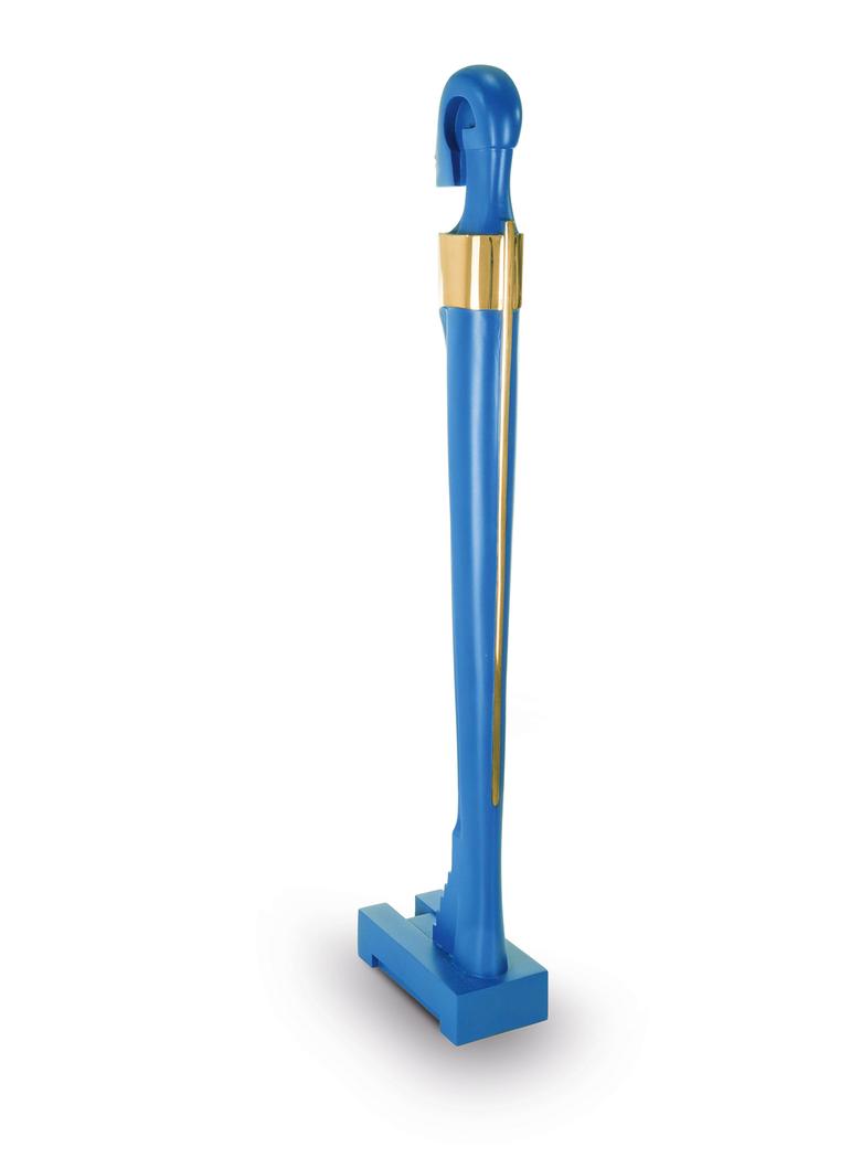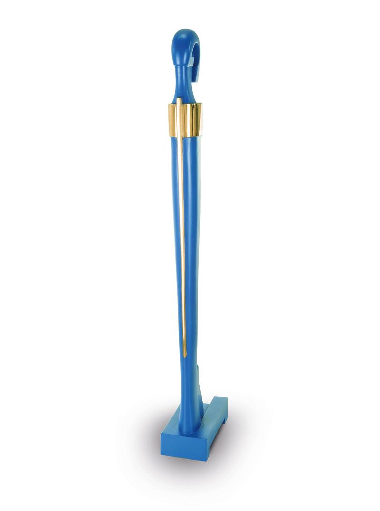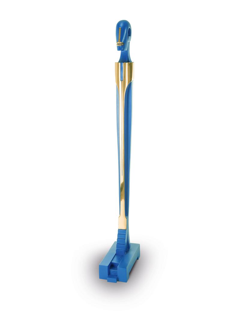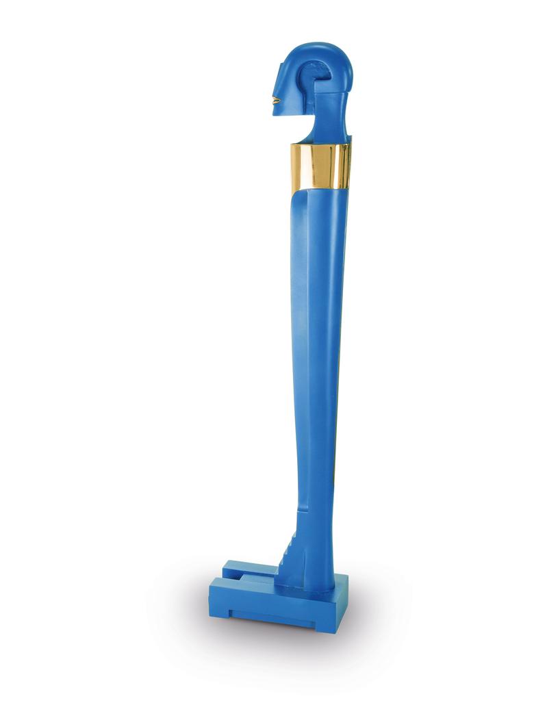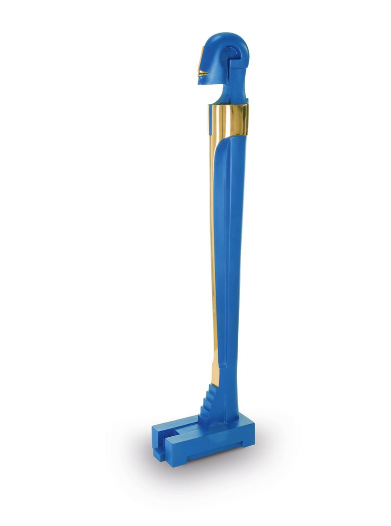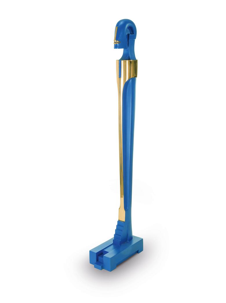 Hoch auf einem mattgestrahlten Sockel stehend erfüllt das Idol den Raum mit großer und zugleich unnahbarer Präsenz.
