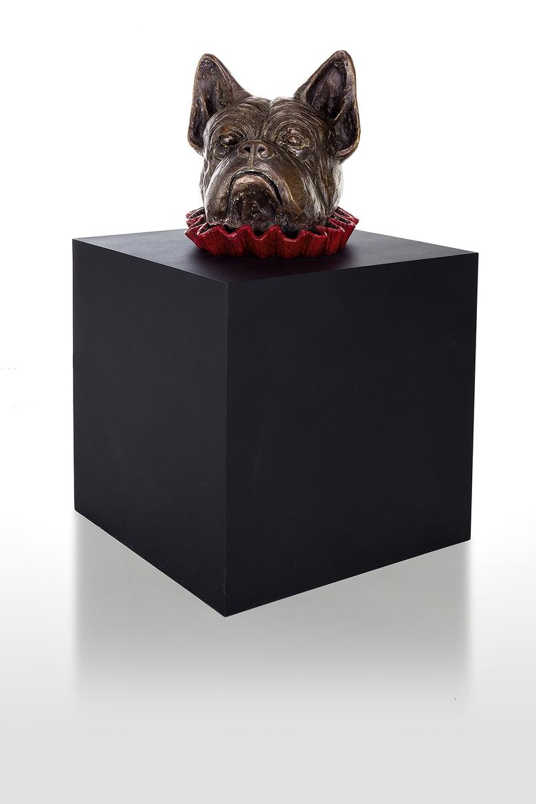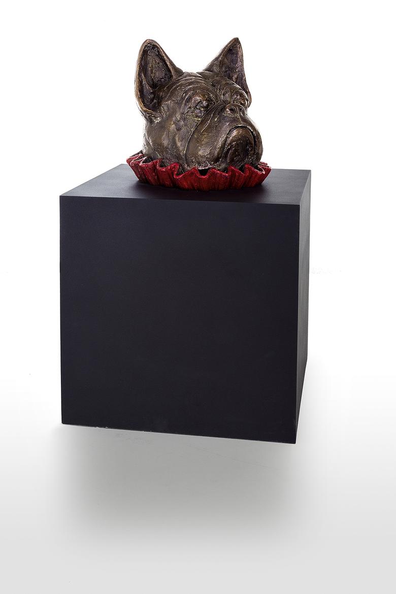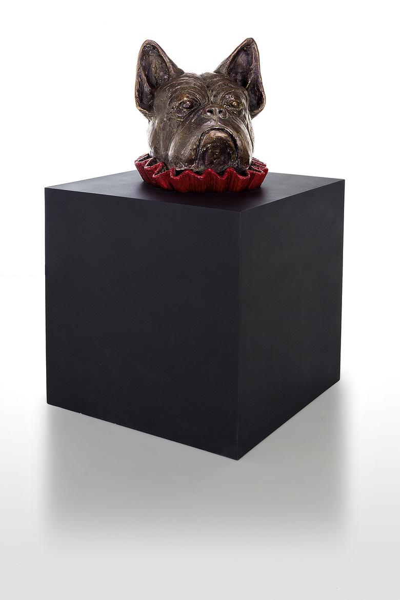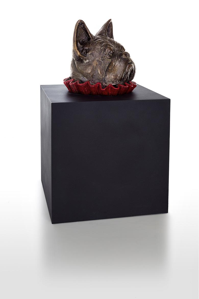 Er will nur spielen … Messer präsentiert eine Bulldogge, deren Kopf bunt umkränzt aus einer tiefschwarzen Kiste ragt, ein wenig an eine Art Praline erinnernd. Schönheit, will sie uns vielleicht mitteilen, liegt allemal in den Augen des Betrachters.