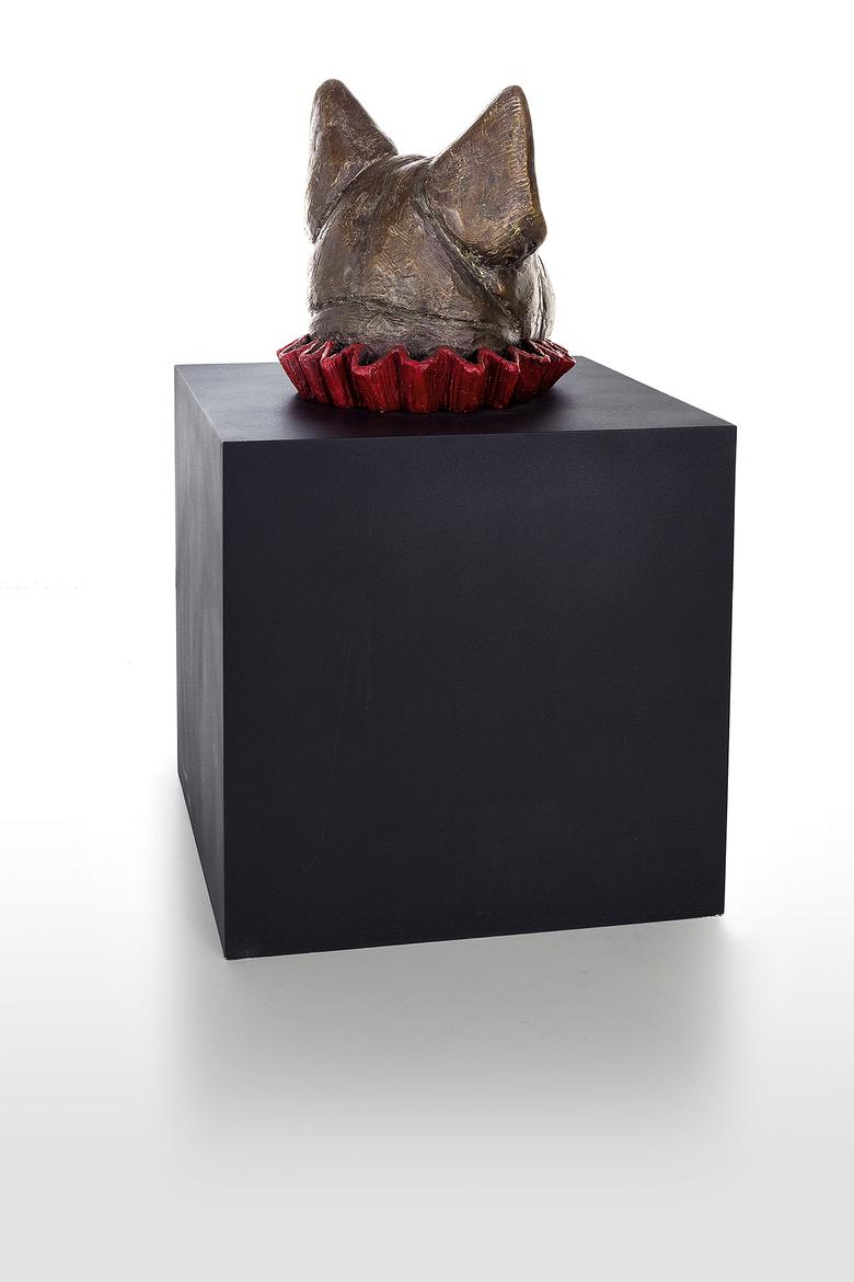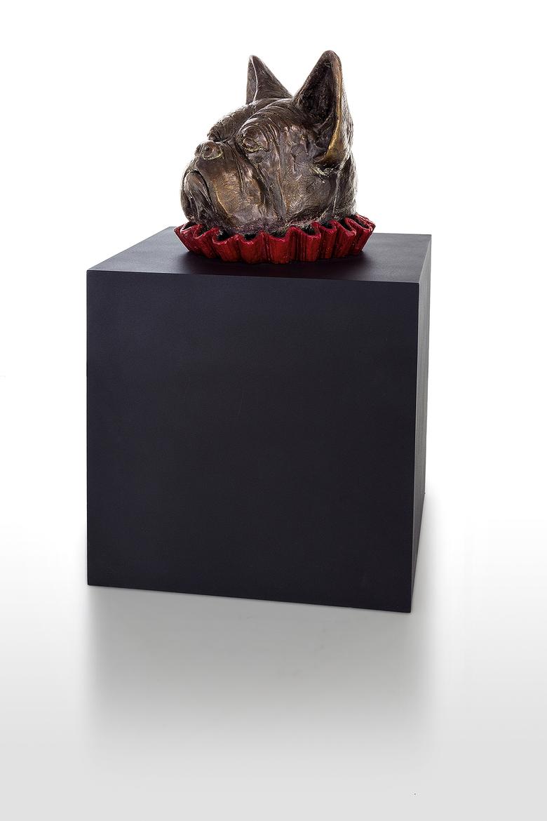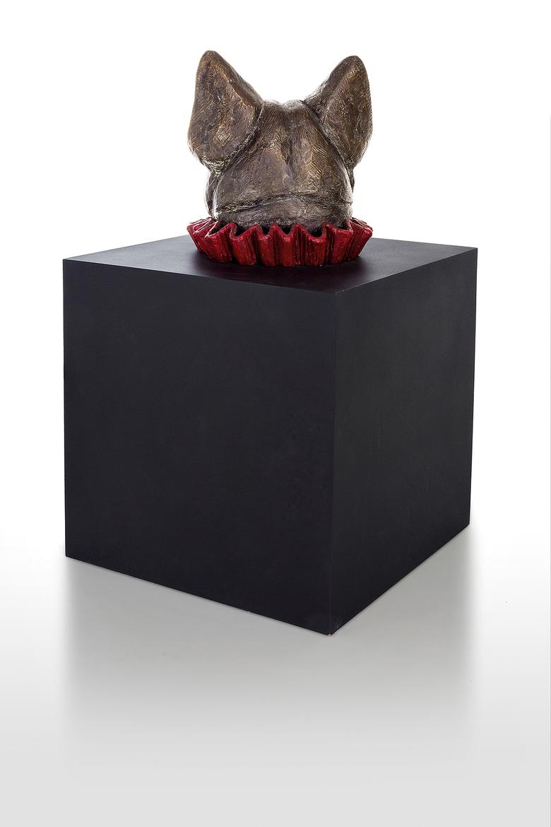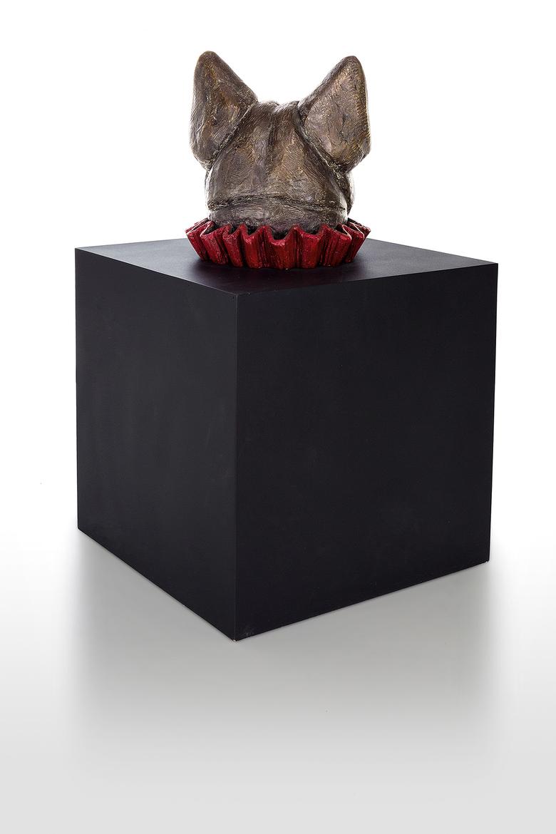 Er will nur spielen … Messer präsentiert eine Bulldogge, deren Kopf bunt umkränzt aus einer tiefschwarzen Kiste ragt, ein wenig an eine Art Praline erinnernd. Schönheit, will sie uns vielleicht mitteilen, liegt allemal in den Augen des Betrachters.