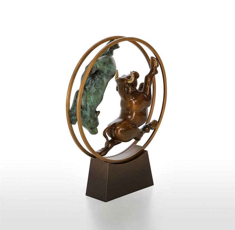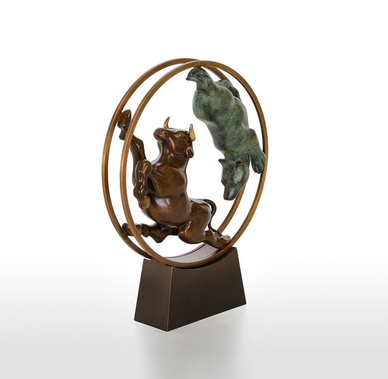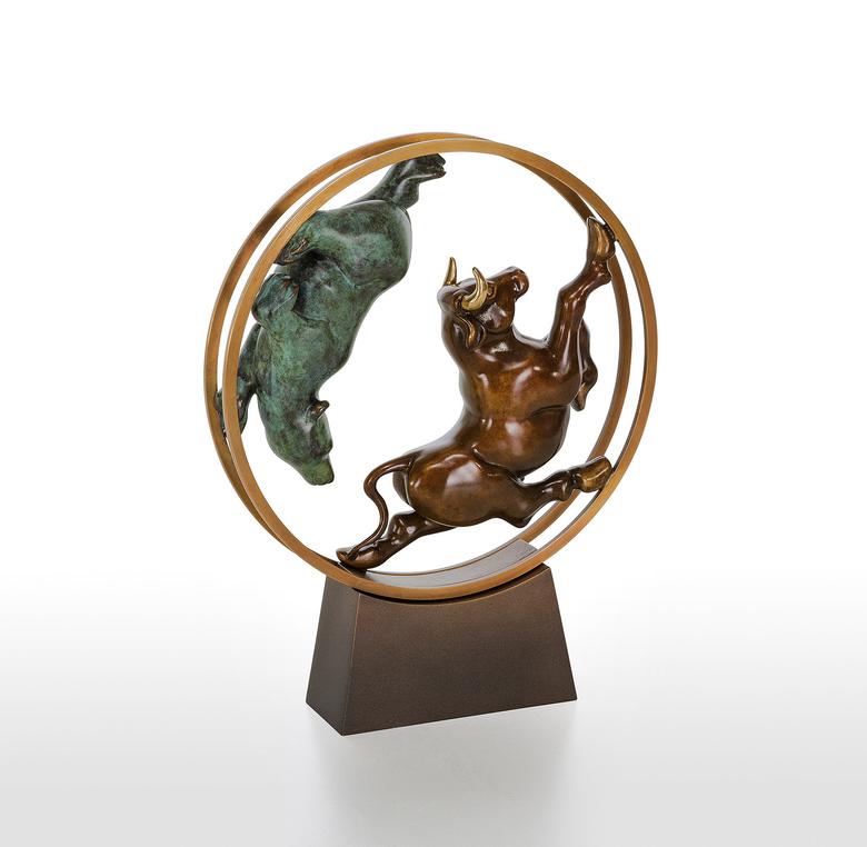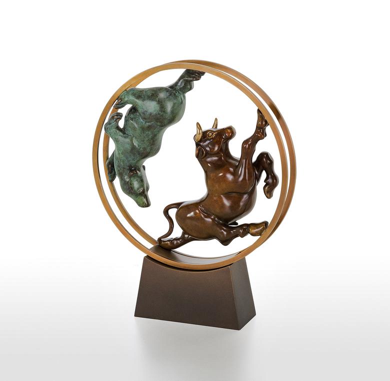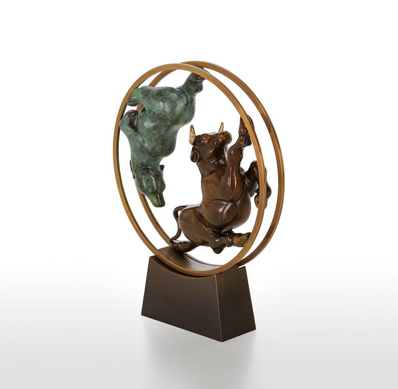 Bulle und Bär haben als Symbole in der Welt der Aktien feste Rollen: Im ständigen Auf und Ab der Aktienkurse jagen sie sich einander verfolgend durch das (bewegliche) Börsen-Hamsterrad.