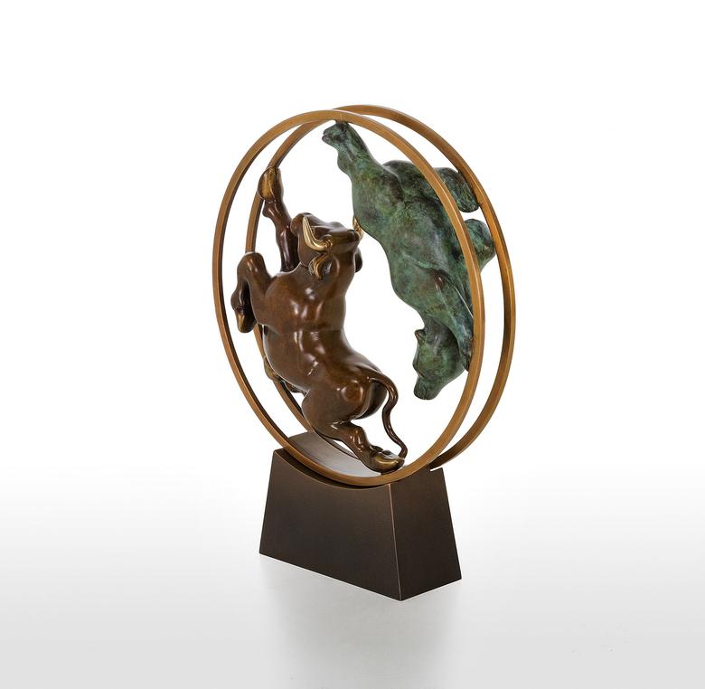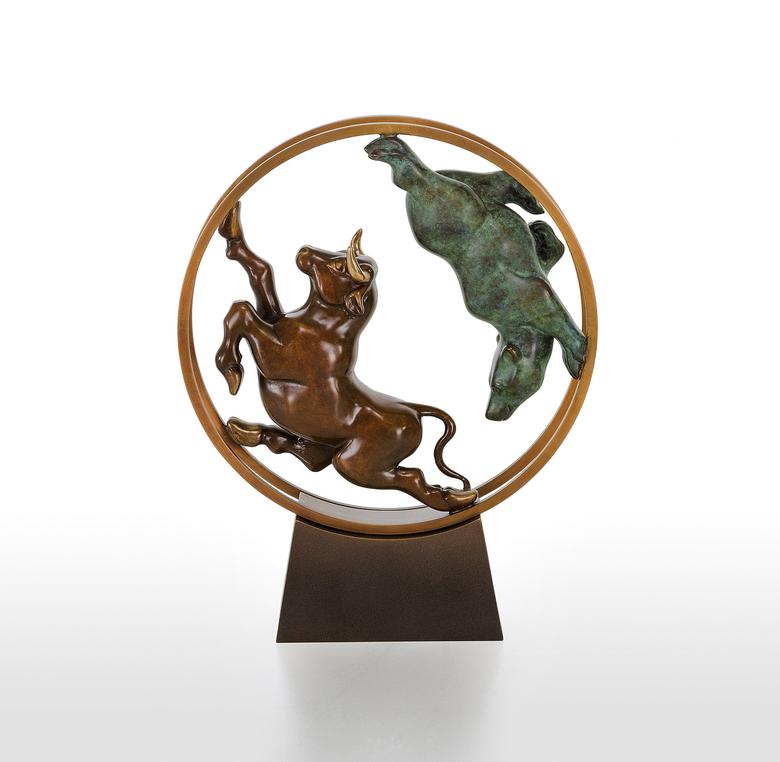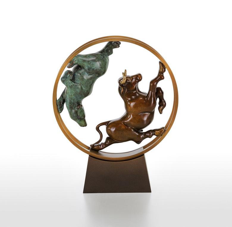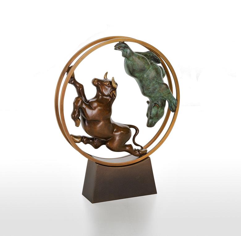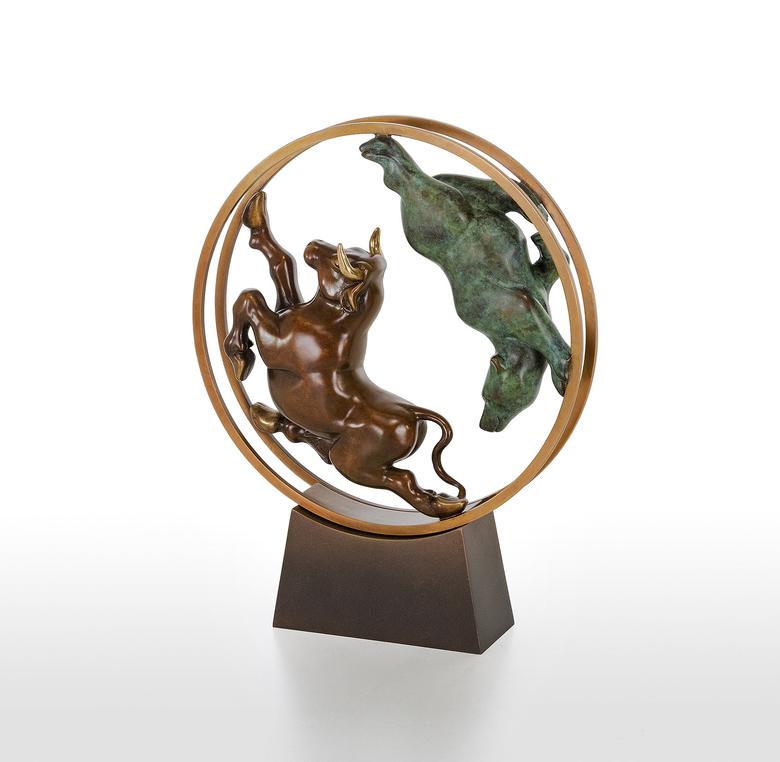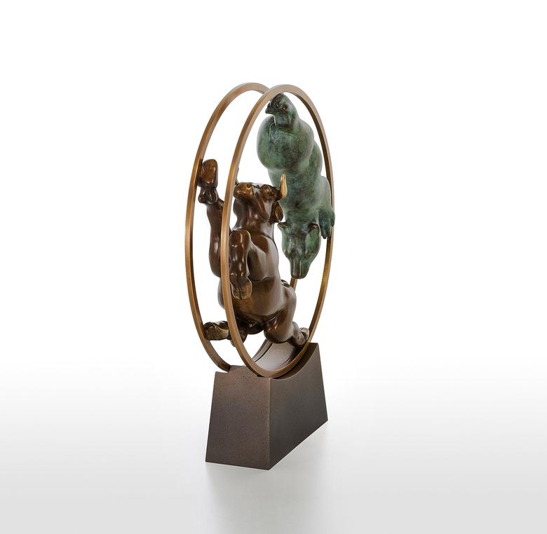 Bulle und Bär haben als Symbole in der Welt der Aktien feste Rollen: Im ständigen Auf und Ab der Aktienkurse jagen sie sich einander verfolgend durch das (bewegliche) Börsen-Hamsterrad.