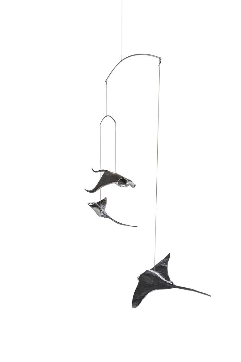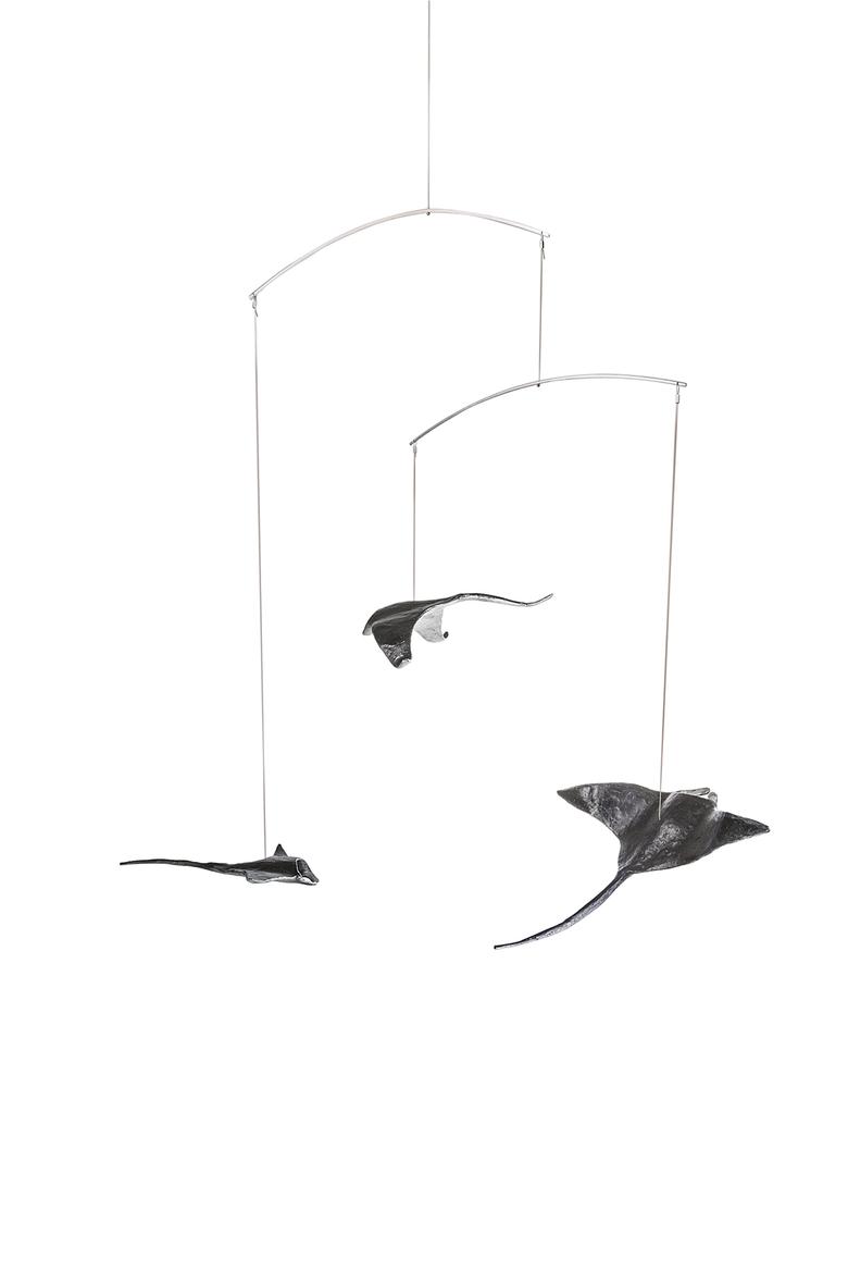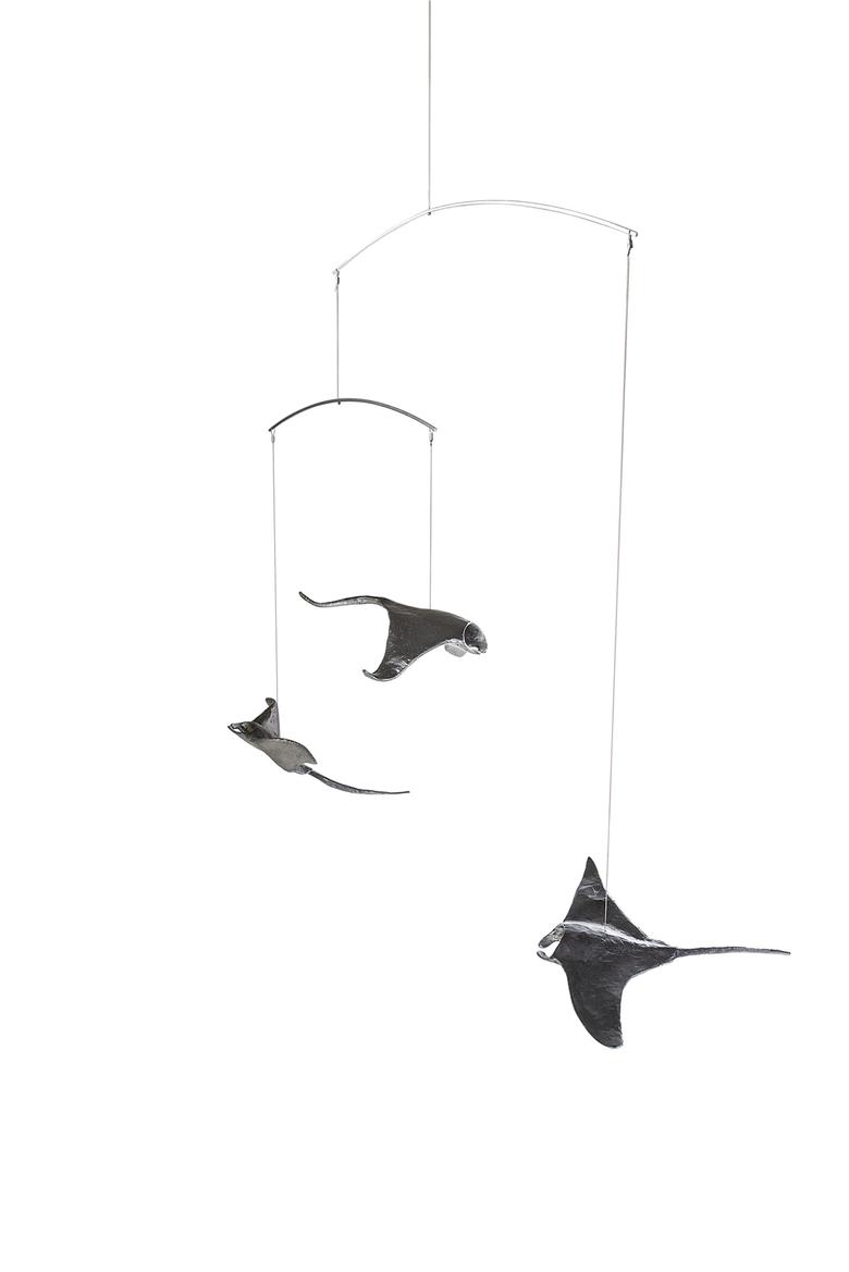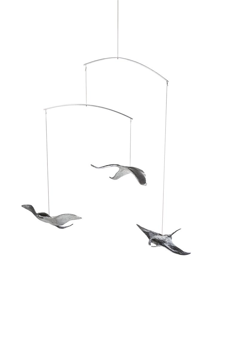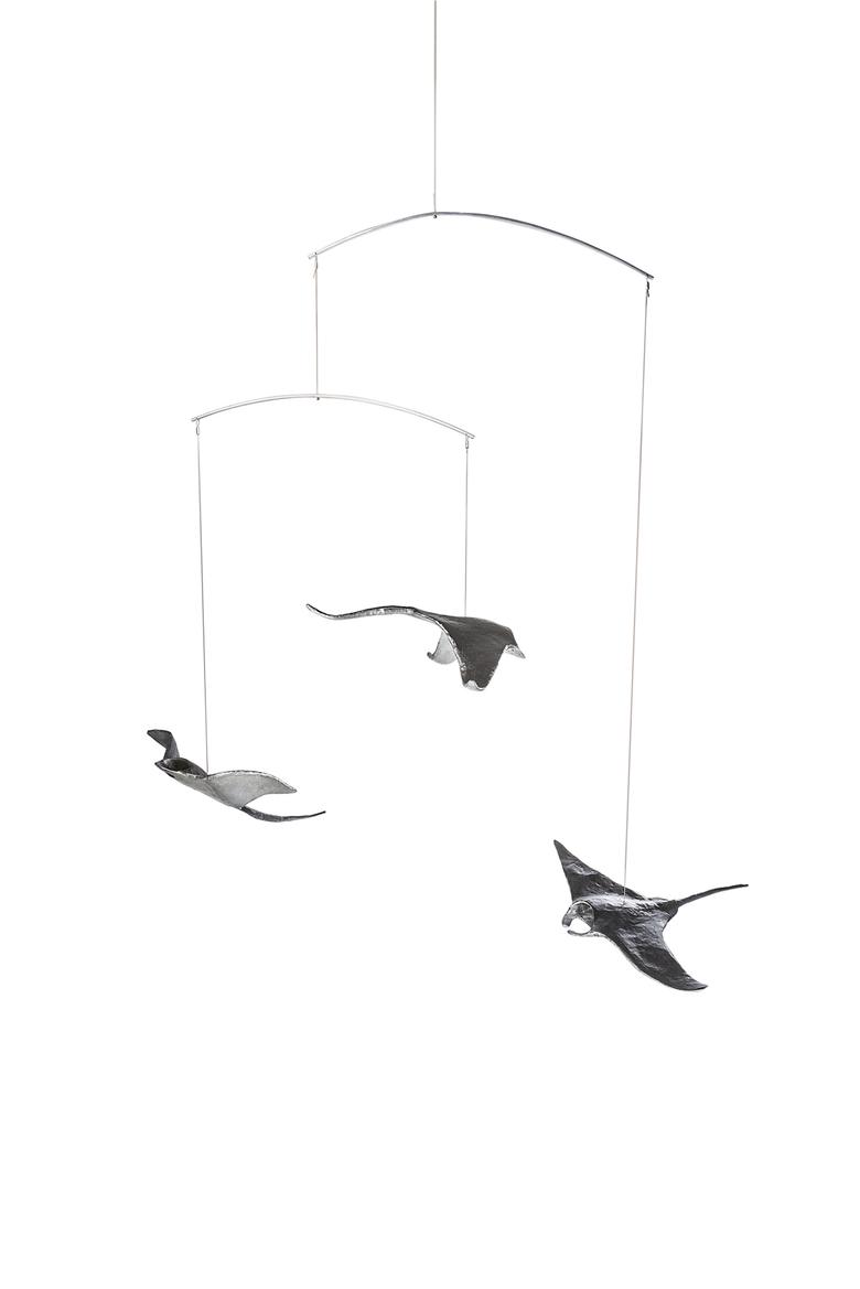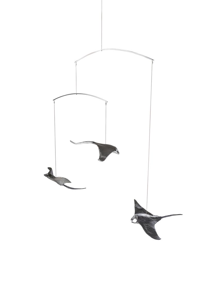 Ebenso majestätisch wie ihre Vorbilder durch das Meer, schweben diese drei an der Raumdecke hängenden Mantas durch den Raum.