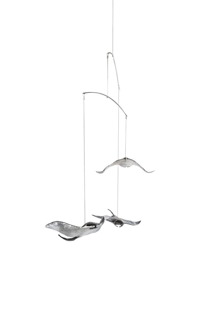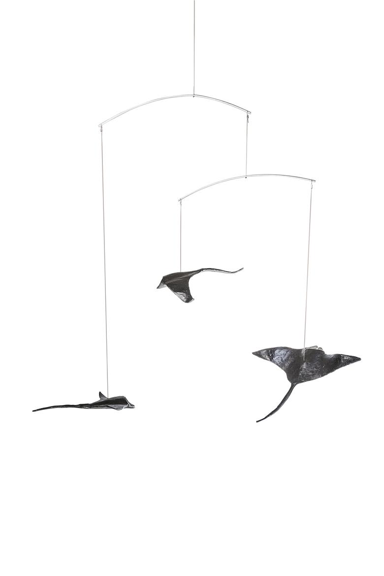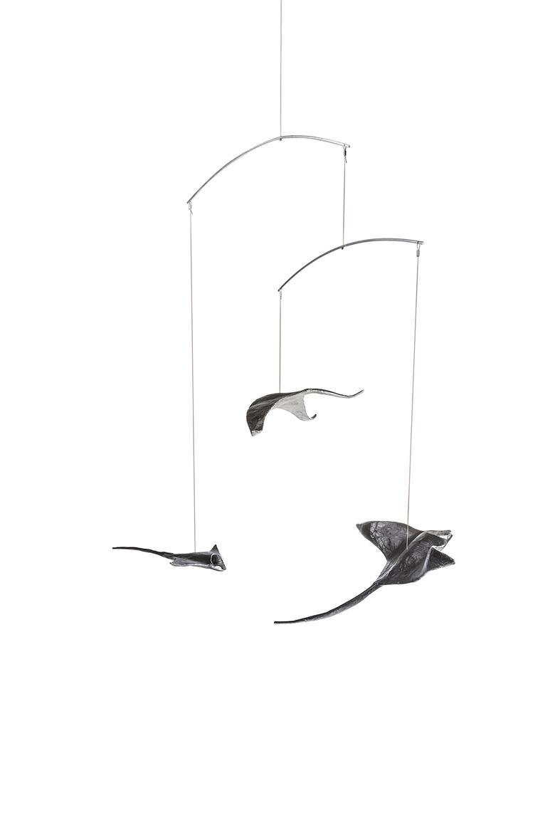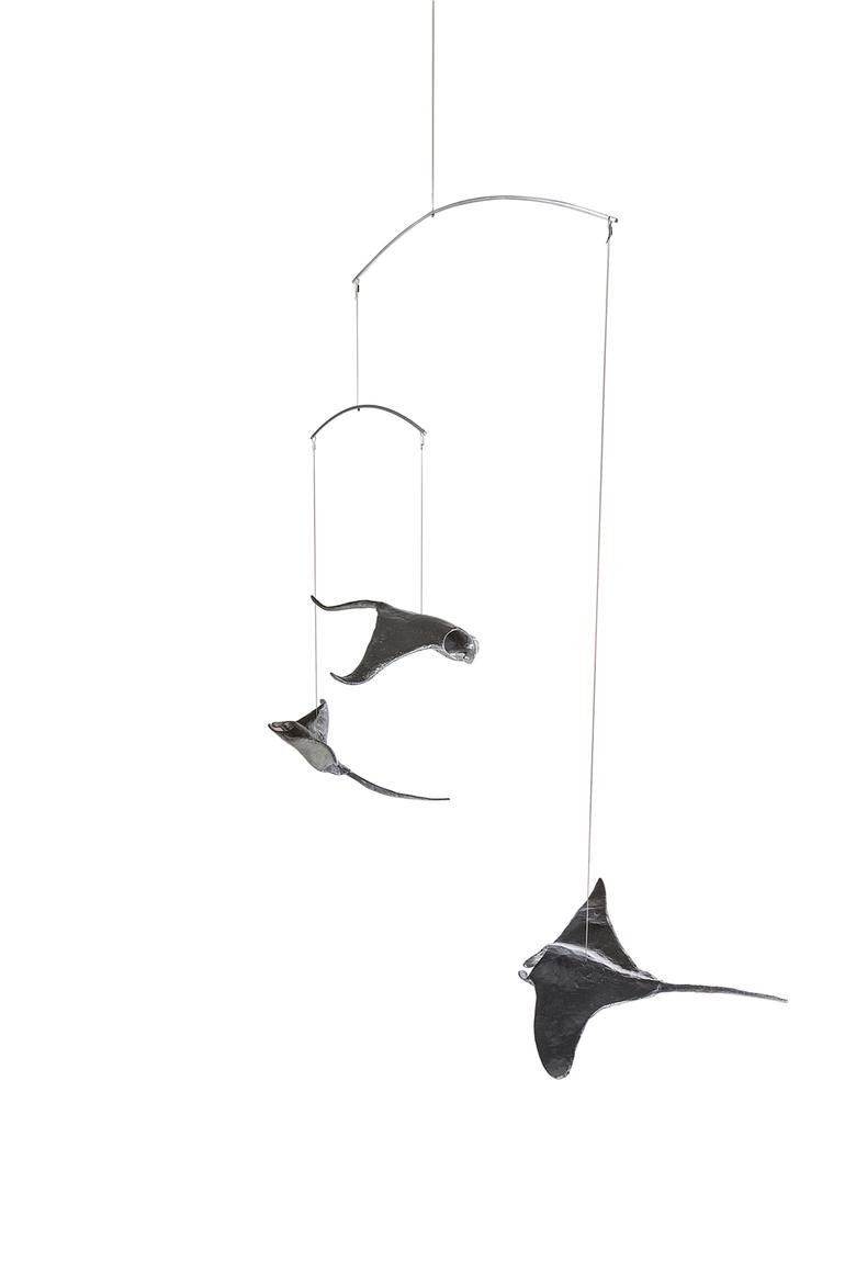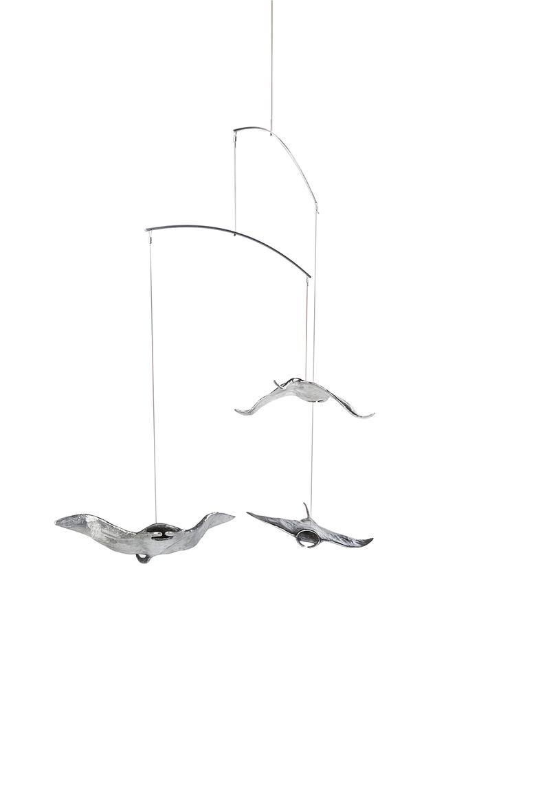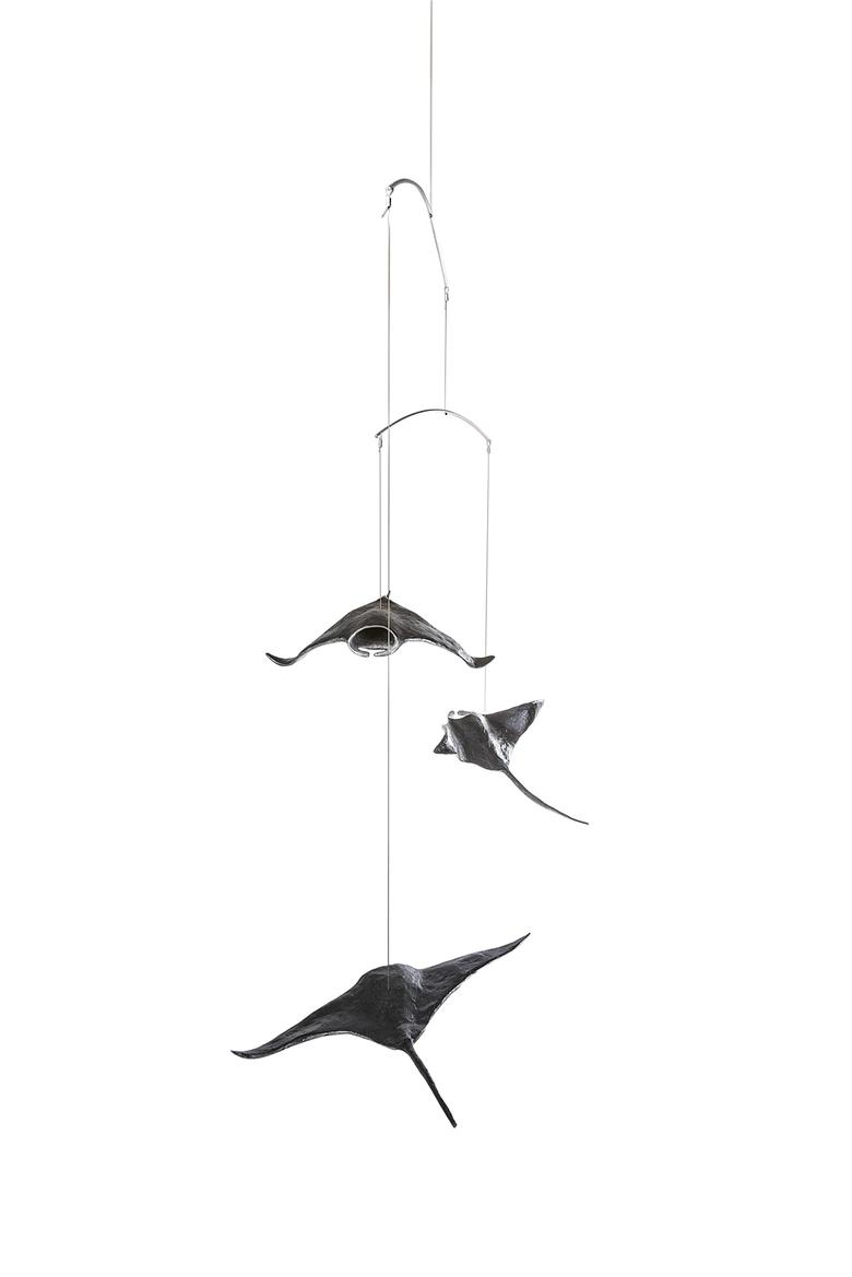 Ebenso majestätisch wie ihre Vorbilder durch das Meer, schweben diese drei an der Raumdecke hängenden Mantas durch den Raum.