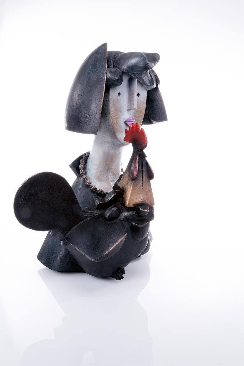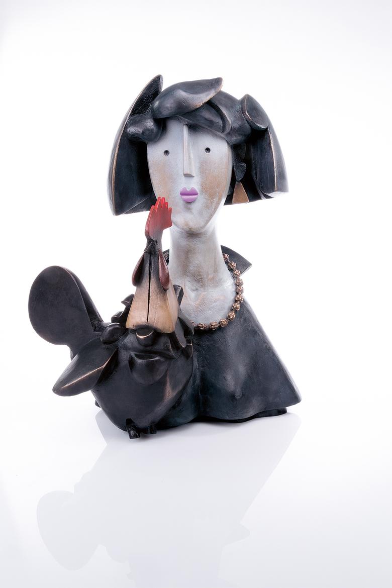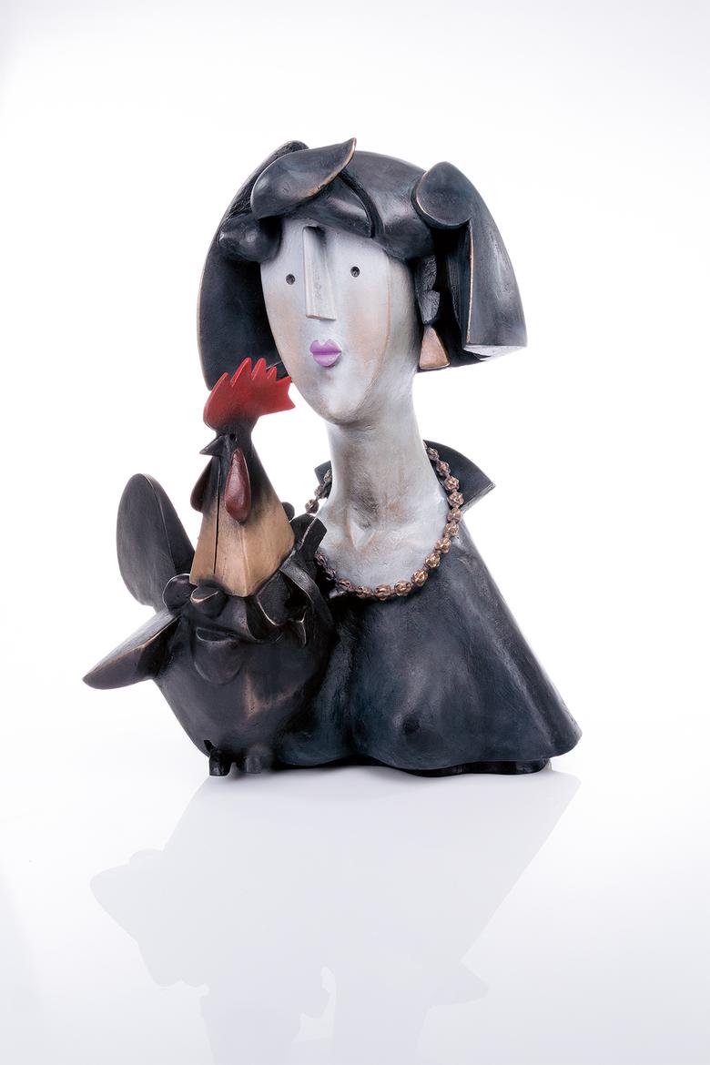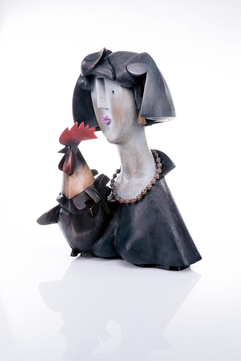 Beiden ihr Schmuck, beiden ihre Schönheit: Bigis „Floo“ betont die Eleganz ihres blassen Teints mit Rouge und Lippenstift und trägt ein goldenes Collier nebst Ohrgehänge – aber auch ihr Hahn ist nicht ohne Schmuck: Stolz streckt er dem Betrachter seinen roten Kamm entgegen.