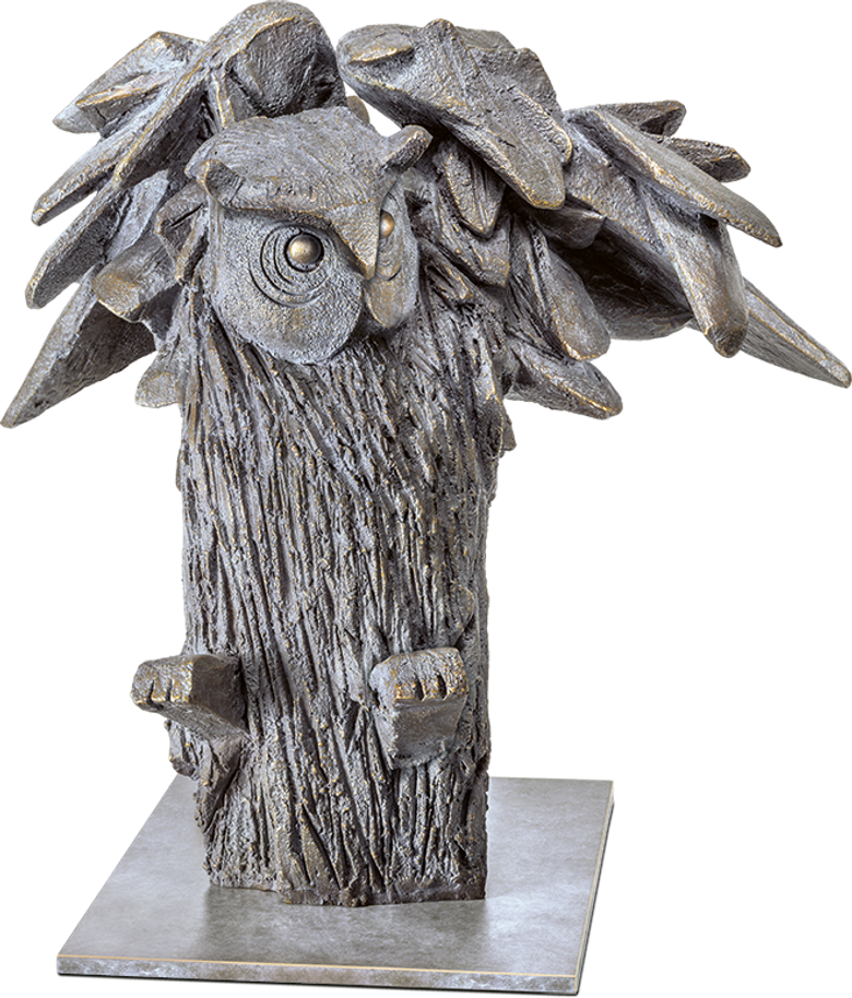 Bigi zeigt die Eule als Waldgeist und als Wächter der Bäume und lässt sie so geradezu aus einem angedeuteten Baumstamm heraustreten.