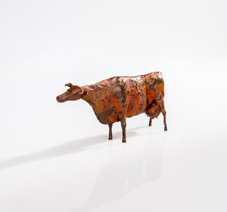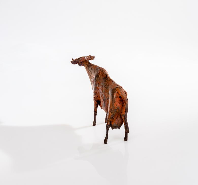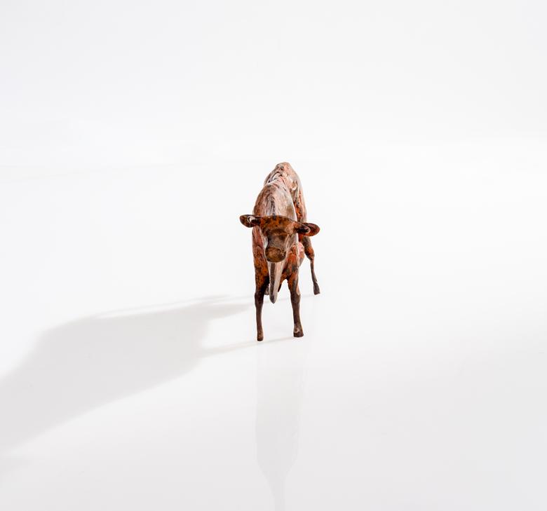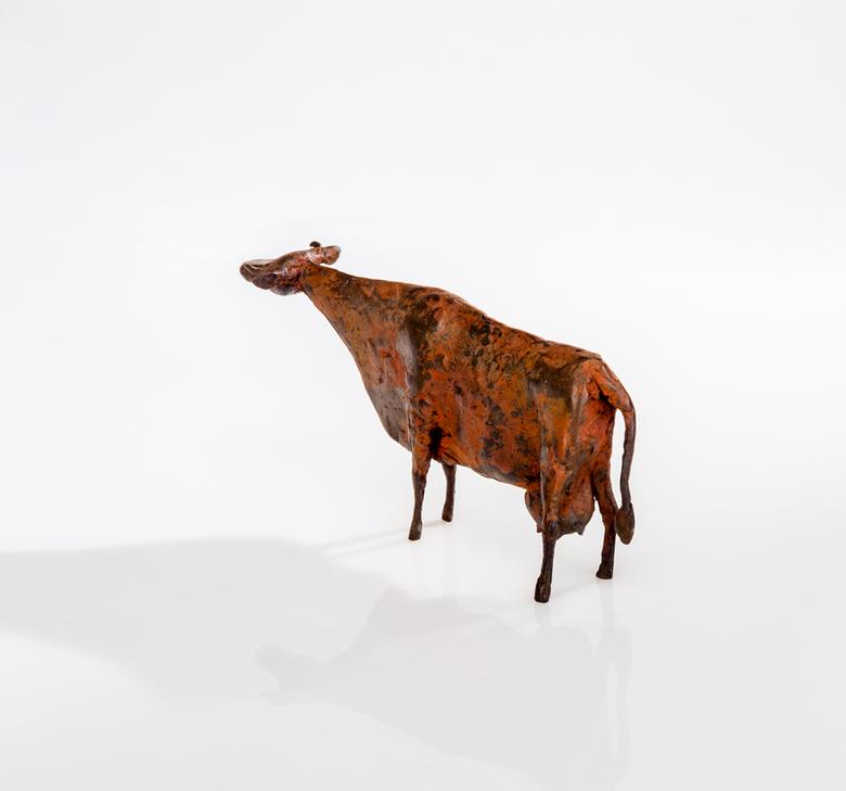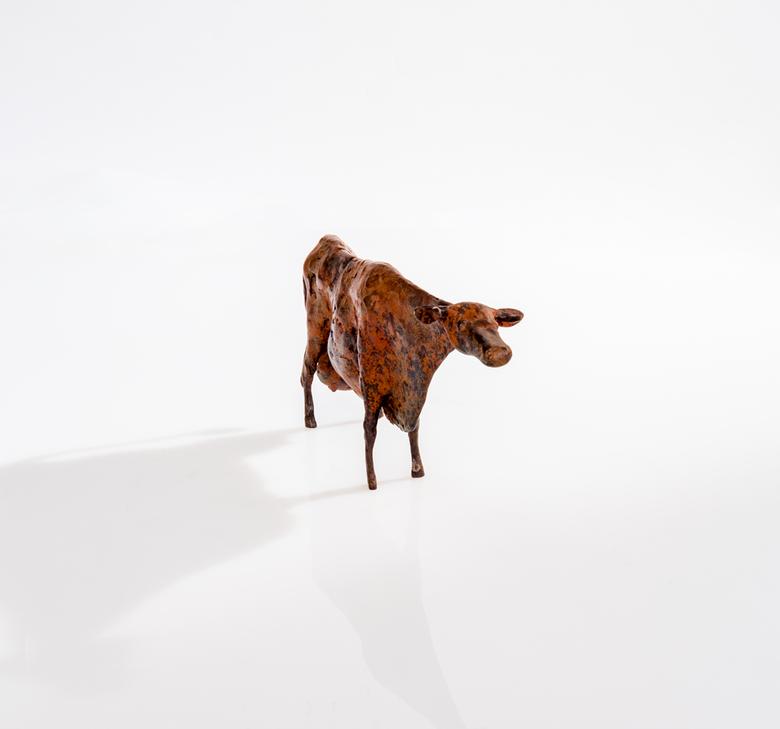 The typical clearly brought out, with a protruding middle body that radiates stability and warmth. Given a patina that takes up the reddish tone of weathered frescoes –- a reminiscence of archaic animal depictions. The artist comments on this: “The cow, the maternal animal, stands as a result of her static as a calming pole in the hustle and bustle of our times, conveying stillness and shelter.” Sometimes, though, people claim to sense a silent smile of derision for one’s own good nature and stolidity –- or even that the gentle animals are up to some mischief…