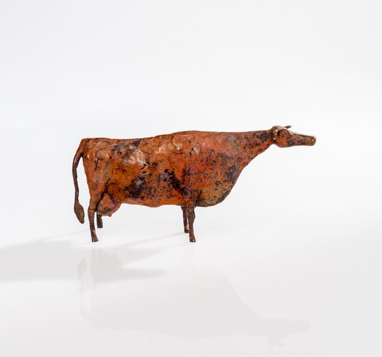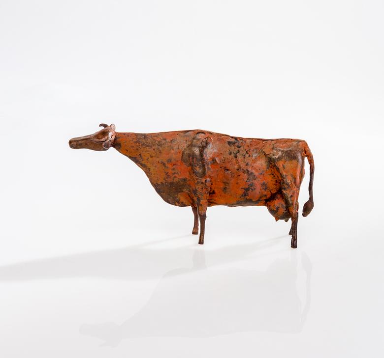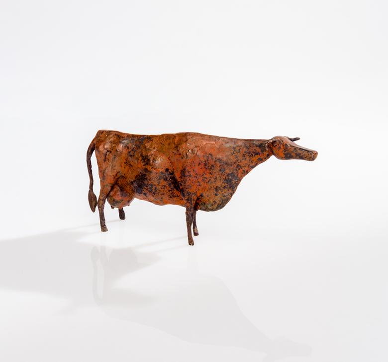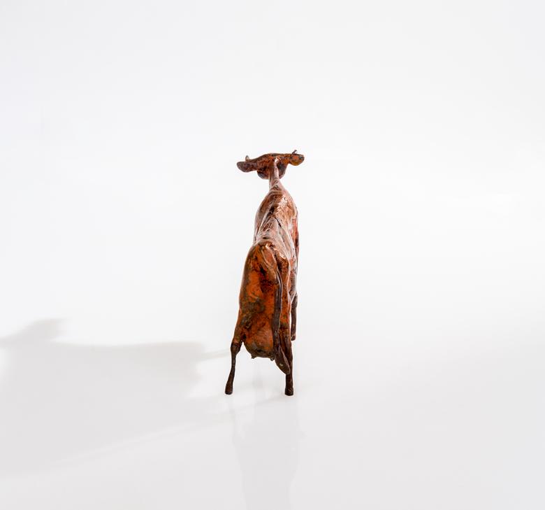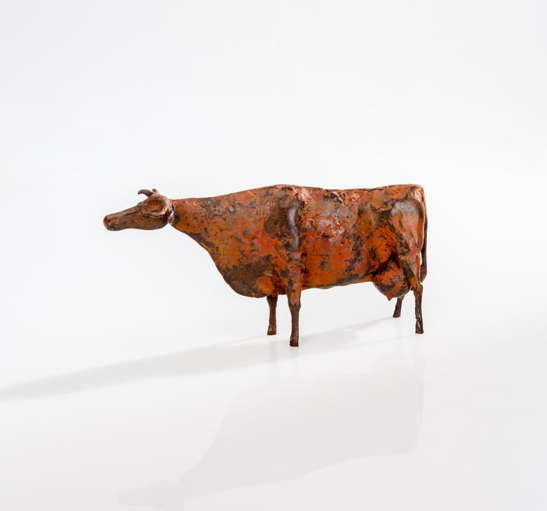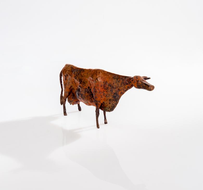 The typical clearly brought out, with a protruding middle body that radiates stability and warmth. Given a patina that takes up the reddish tone of weathered frescoes –- a reminiscence of archaic animal depictions. The artist comments on this: “The cow, the maternal animal, stands as a result of her static as a calming pole in the hustle and bustle of our times, conveying stillness and shelter.” Sometimes, though, people claim to sense a silent smile of derision for one’s own good nature and stolidity –- or even that the gentle animals are up to some mischief…