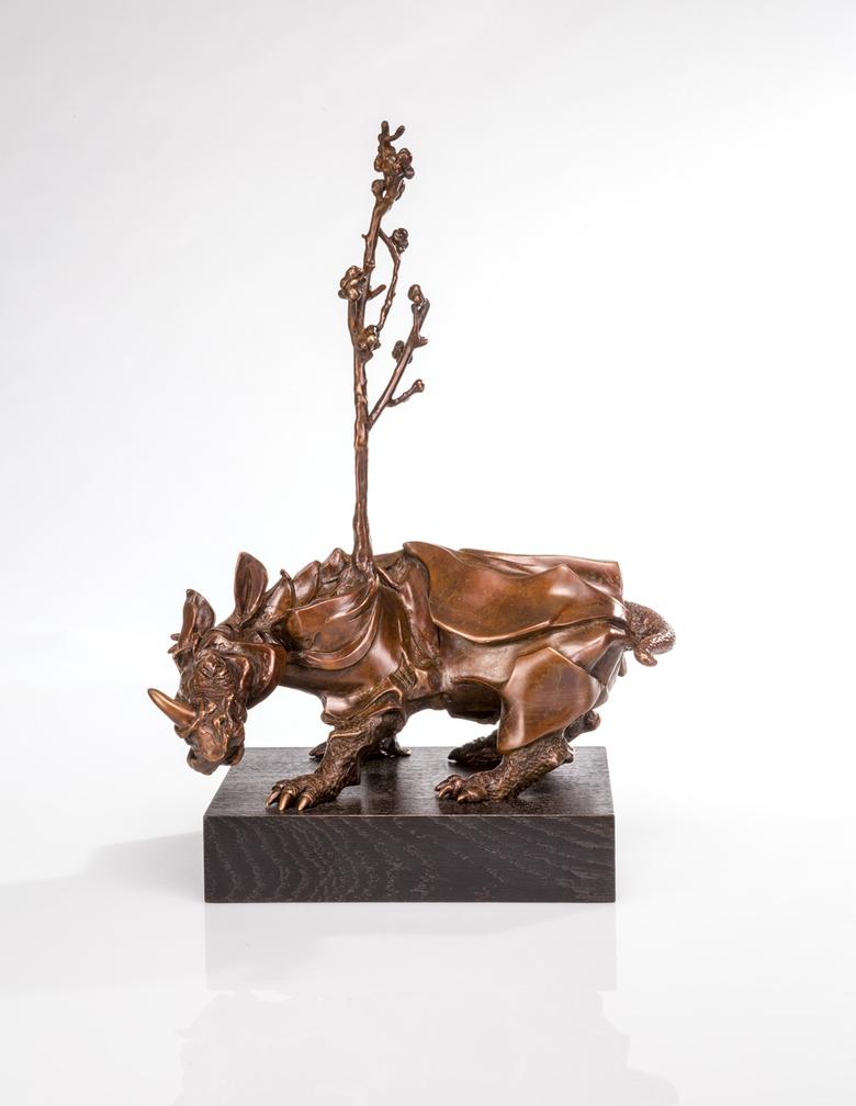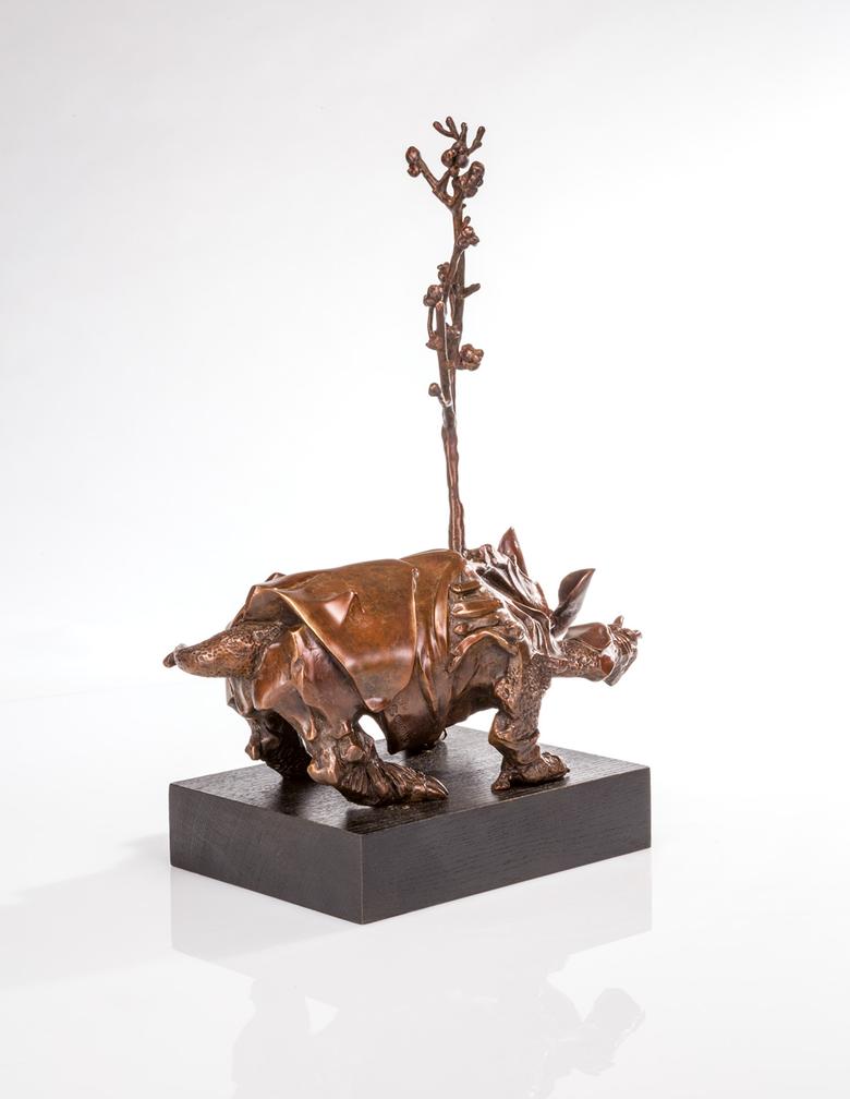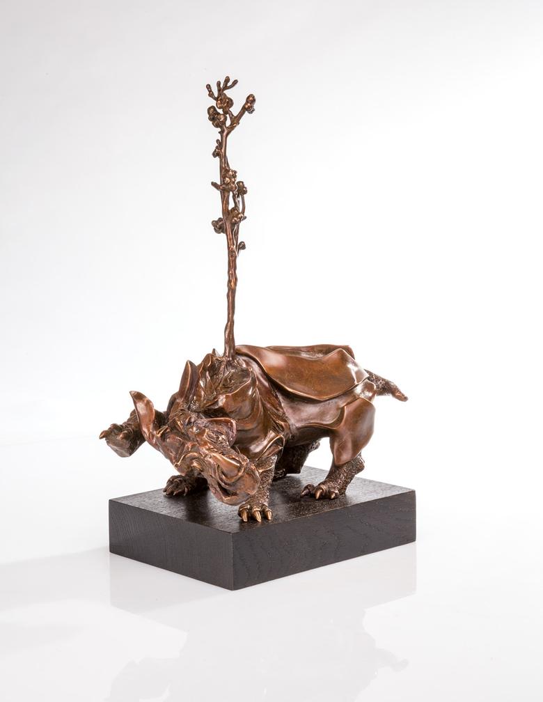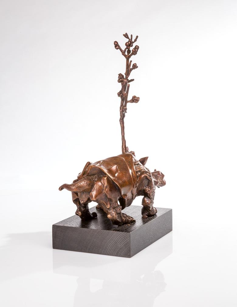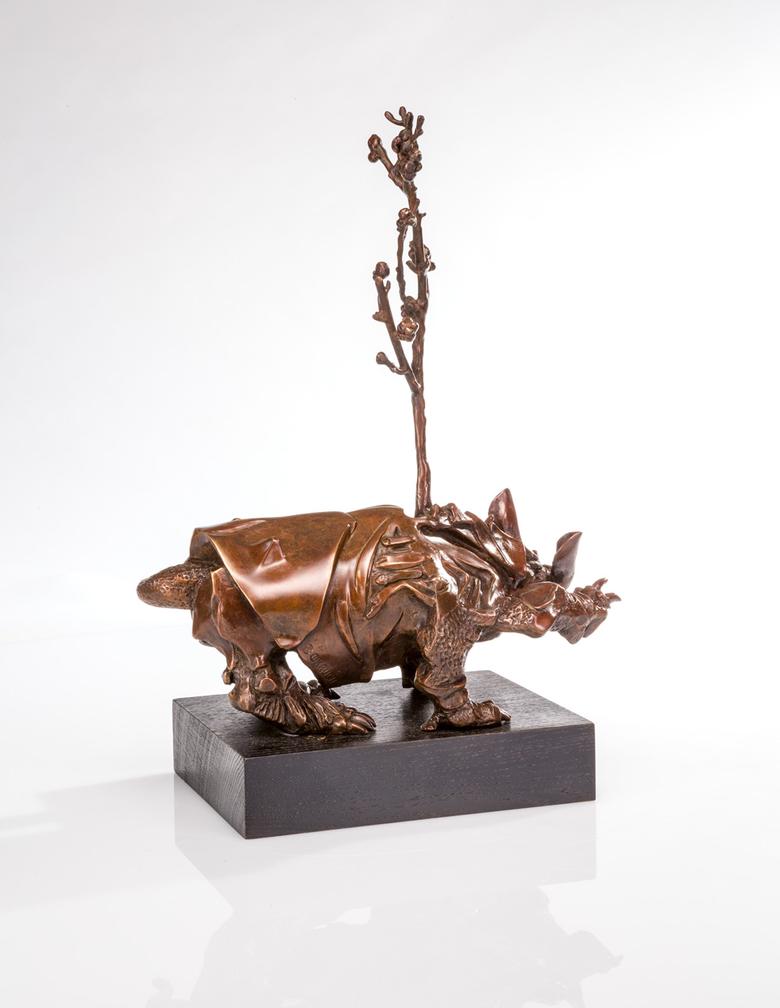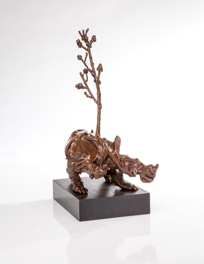 Kruch’s rhinoceros, which recalls Dürer’s famous drawing, is a symbol of life and death. At a ripe old age, it stands on the threshold of death, yet new life has long been emerging from him in the form of a tree.