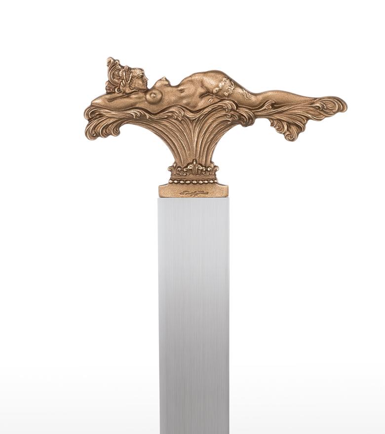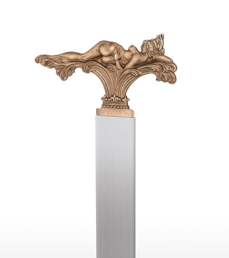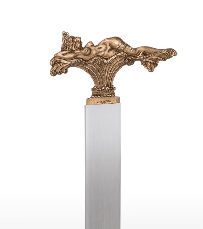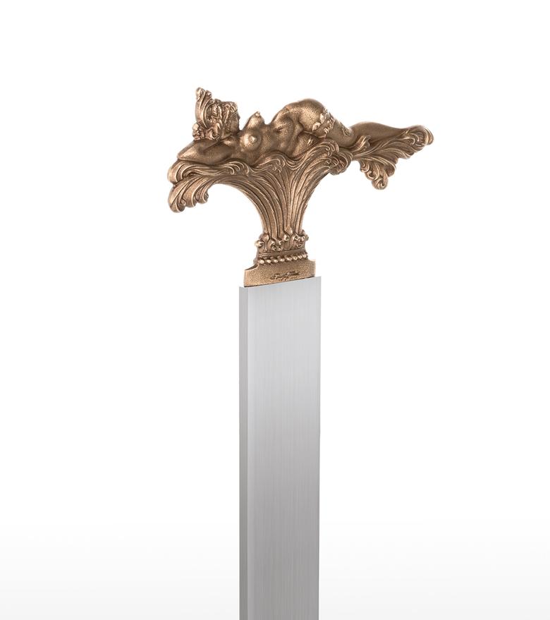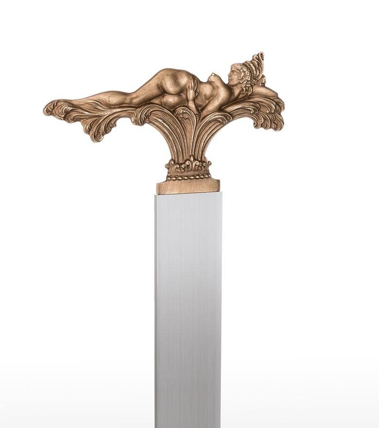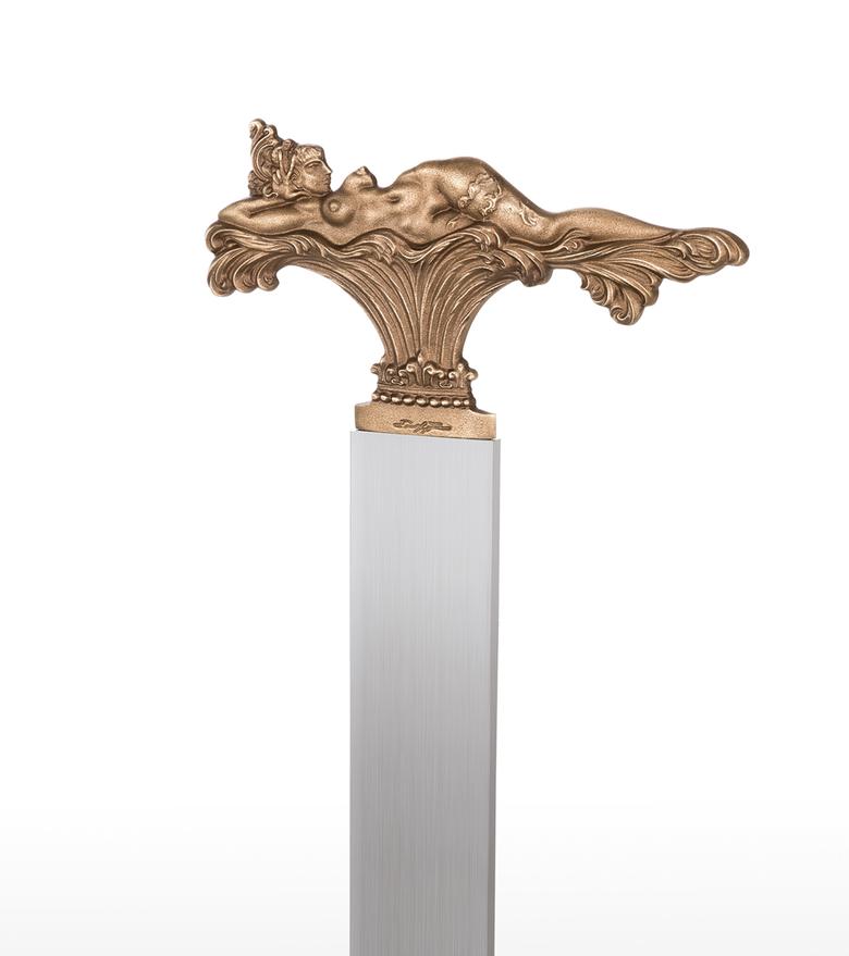 "In the three motifs from my pictorial world, the foreground is taken by what occasioned this design: to shape the view which can only be seen in a picture from one side (back or front) so that it enables a view of the hidden side in the sense of sculptural comprehension. The motif of the lying figure is taken from the picture "The Tower of Icarus" and where only the front is showing. At that time I already thought it a shame that I could not show the back at the same time, for only a three-dimensional design of a relief could fulfil its meaning. – How does the front of this back view of a nude look? – This three-dimensional designing of a painted view became the most important theme for me as a new possibility within the scope of my working with sculpture and, to my knowledge, is also rather unique in the field of art history, as far as three-dimensional expression is concerned. After I had designed these two views in three-dimensional relief, I was also interested in using a cherub's head whose front and back are identical. In the course of some experimenting, this gave rise to this triptych of the three-dimensional relief. The aesthetic aspects were then optimally brought out by the geometrically uniform base made of stainless steel and contrasting with the bronze. In this way, I hoped that the fans of my sculptural work would get almost as much enjoyment from this new aspect of my art as I do." Ernst Fuchs)