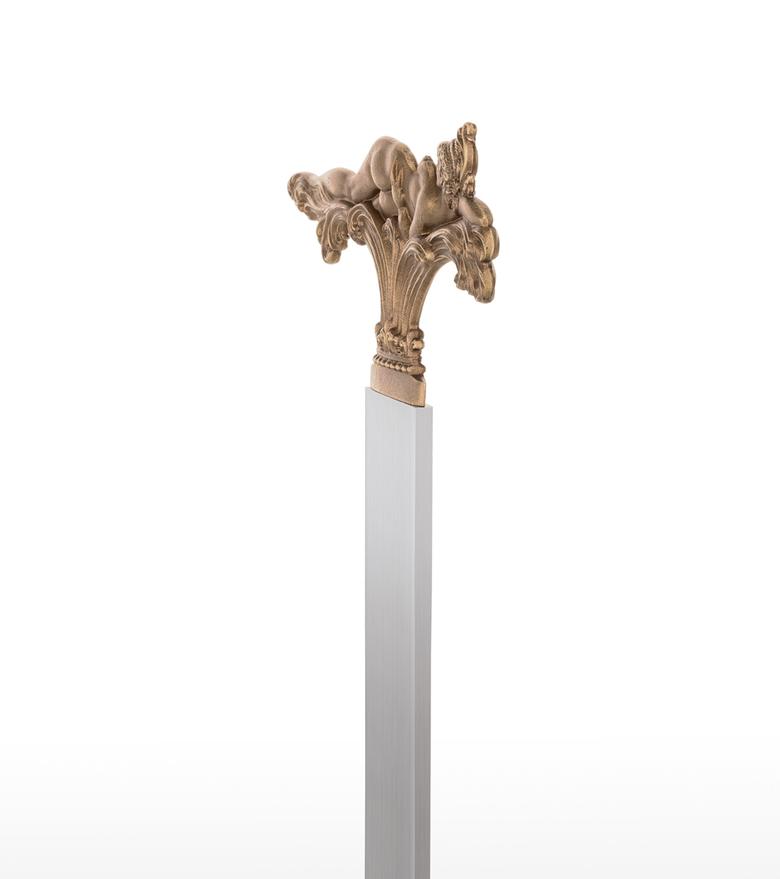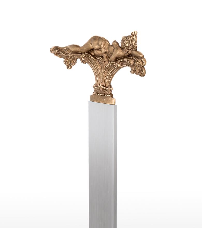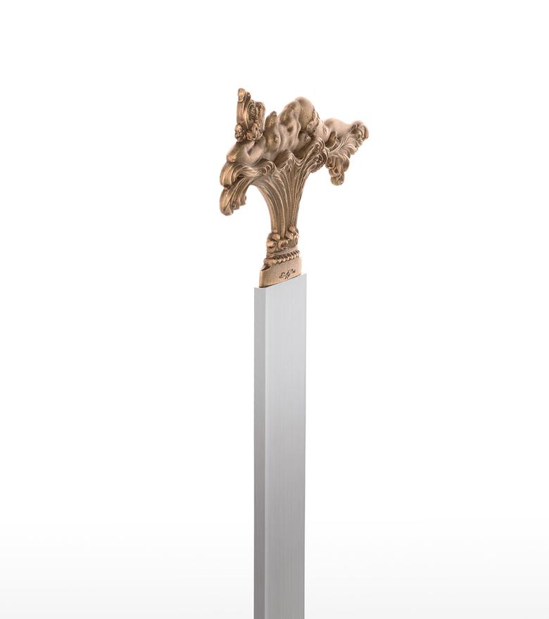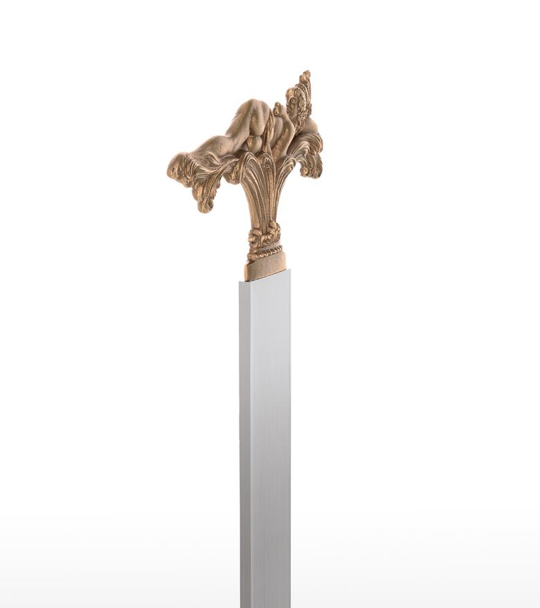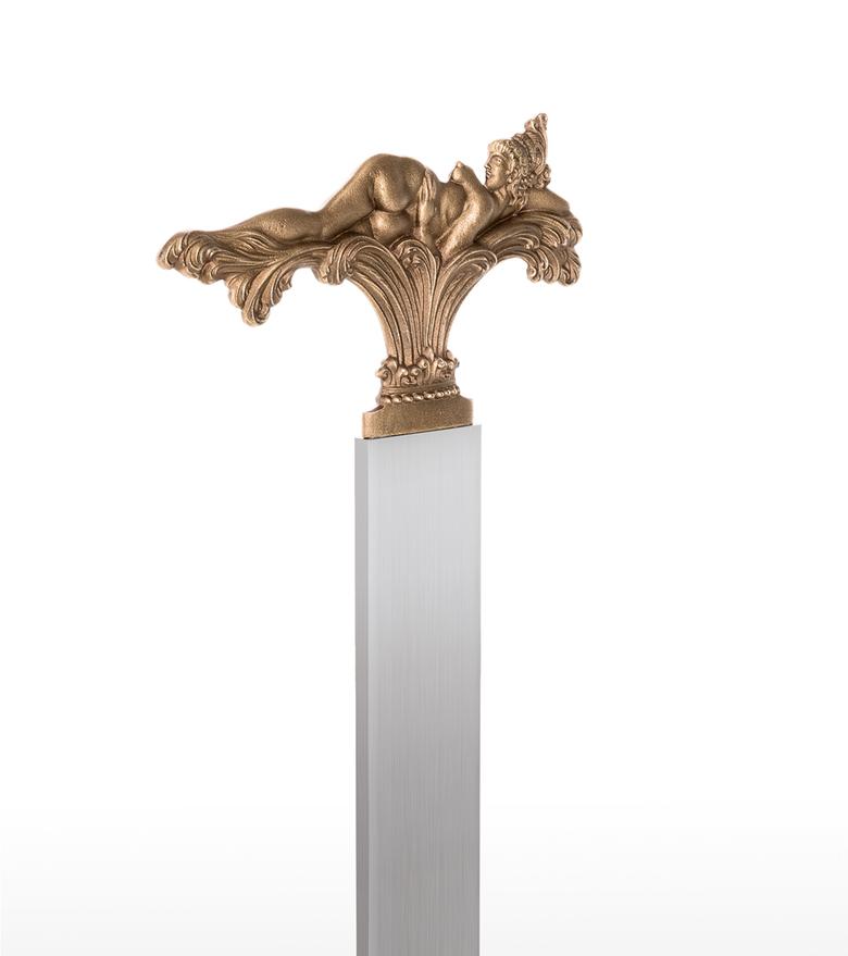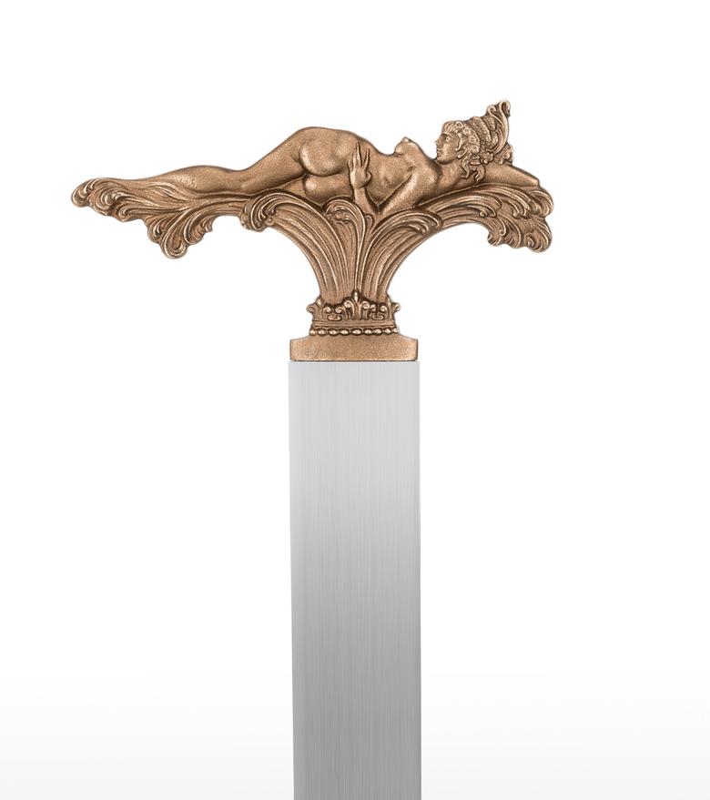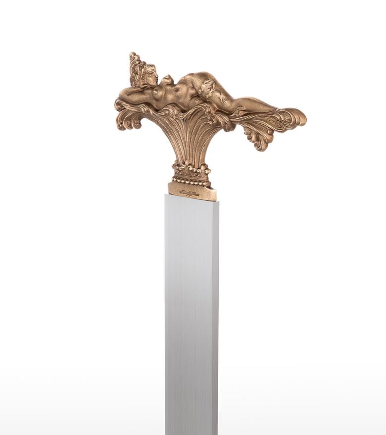 "In the three motifs from my pictorial world, the foreground is taken by what occasioned this design: to shape the view which can only be seen in a picture from one side (back or front) so that it enables a view of the hidden side in the sense of sculptural comprehension. The motif of the lying figure is taken from the picture "The Tower of Icarus" and where only the front is showing. At that time I already thought it a shame that I could not show the back at the same time, for only a three-dimensional design of a relief could fulfil its meaning. – How does the front of this back view of a nude look? – This three-dimensional designing of a painted view became the most important theme for me as a new possibility within the scope of my working with sculpture and, to my knowledge, is also rather unique in the field of art history, as far as three-dimensional expression is concerned. After I had designed these two views in three-dimensional relief, I was also interested in using a cherub's head whose front and back are identical. In the course of some experimenting, this gave rise to this triptych of the three-dimensional relief. The aesthetic aspects were then optimally brought out by the geometrically uniform base made of stainless steel and contrasting with the bronze. In this way, I hoped that the fans of my sculptural work would get almost as much enjoyment from this new aspect of my art as I do." Ernst Fuchs)
