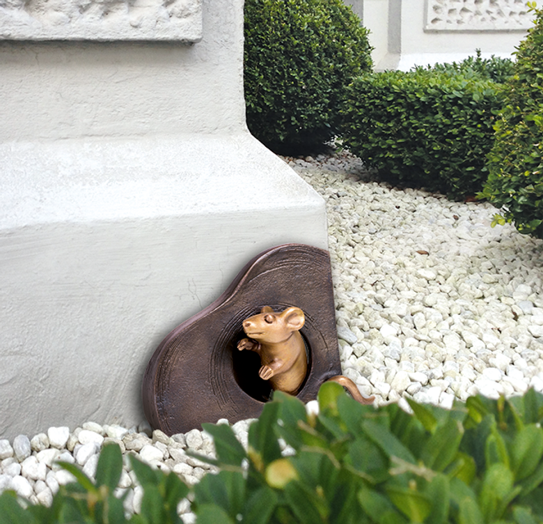 La souris n'apparaît pas seulement dans la forêt et le couloir, elle est une espèce hémérophile et vit volontiers à proximité des humains - déjà dans la fable d’Ésope on raconte la rencontre de la souris des champs (musrusticus) avec la souris de ville (mus urbanus). Ces délicates statues en bronze peuvent être invitées sans crainte chez vous et dans votre jardin, comme de véritables hôtes. Les réserves de fromage restent intactes, rien n'est rongé et même la nuit elles restent silencieuses. Ce rongeur apporte directement sa propre maison – c’est-à-dire son trou de souris.